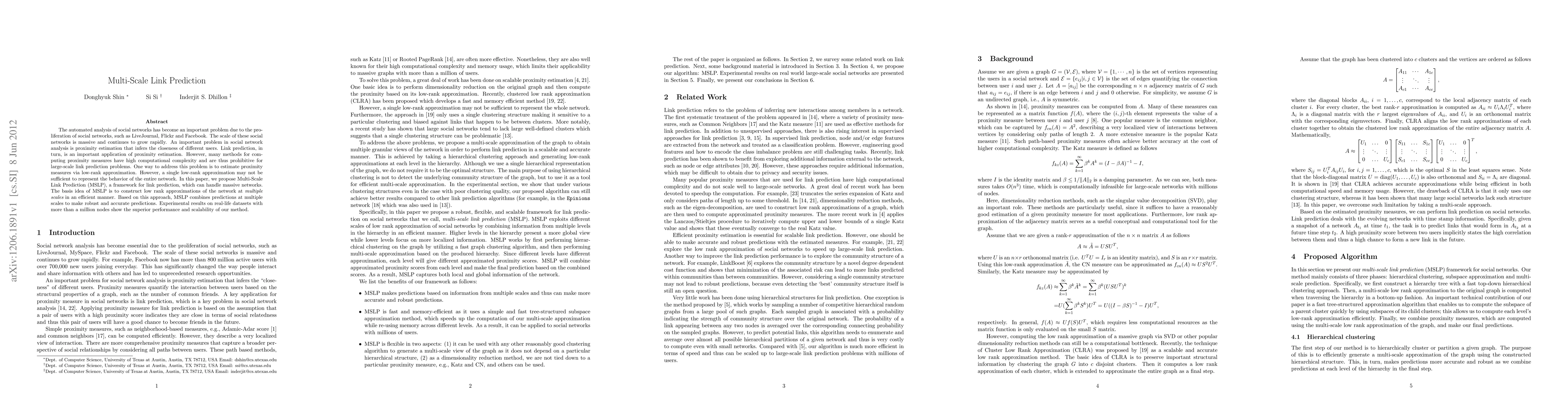 The automated analysis of social networks has become an important problem due to the proliferation of social networks, such as LiveJournal, Flickr and Facebook. The scale of these social networks is massive and continues to grow rapidly. An important problem in social network analysis is proximity estimation that infers the closeness of different users. Link prediction, in turn, is an important application of proximity estimation. However, many methods for computing proximity measures have high computational complexity and are thus prohibitive for large-scale link prediction problems. One way to address this problem is to estimate proximity measures via low-rank approximation. However, a single low-rank approximation may not be sufficient to represent the behavior of the entire network. In this paper, we propose Multi-Scale Link Prediction (MSLP), a framework for link prediction, which can handle massive networks. The basis idea of MSLP is to construct low rank approximations of the network at multiple scales in an efficient manner. Based on this approach, MSLP combines predictions at multiple scales to make robust and accurate predictions. Experimental results on real-life datasets with more than a million nodes show the superior performance and scalability of our method.