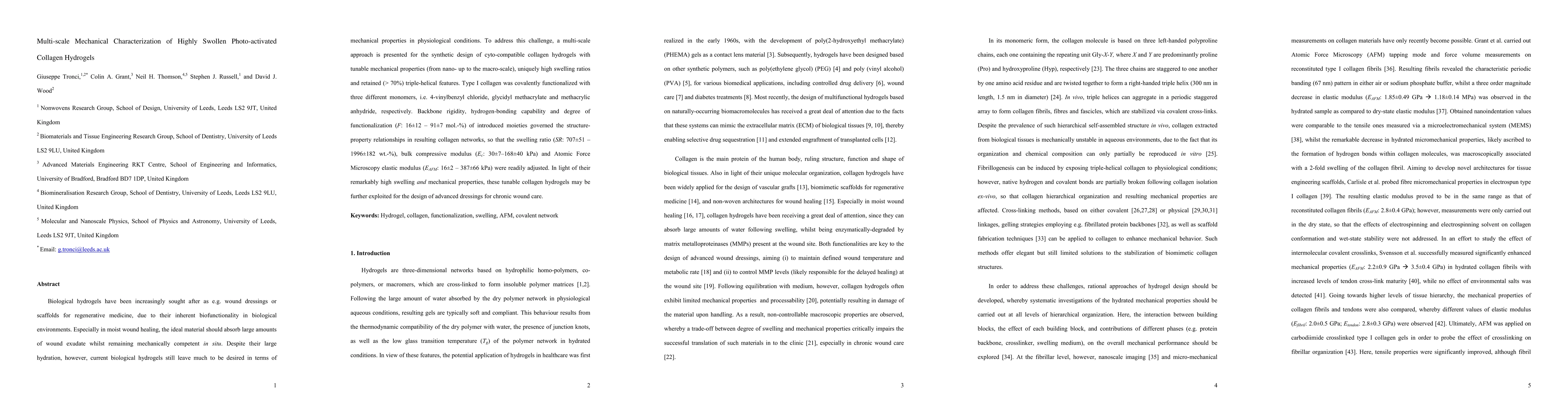 Biological hydrogels have been increasingly sought after as e.g. wound dressings or scaffolds for regenerative medicine, due to their inherent biofunctionality in biological environments. Especially in moist wound healing, the ideal material should absorb large amounts of wound exudate whilst remaining mechanically competent in-situ. Despite their large hydration, however, current biological hydrogels still leave much to be desired in terms of mechanical properties in physiological conditions. To address this challenge, a multi-scale approach is presented for the synthetic design of cyto-compatible collagen hydrogels with tunable mechanical properties (from nano- up to the macro-scale), uniquely high swelling ratios and retained (>70%) triple-helical features. Type I collagen was covalently functionalized with three different monomers, i.e. 4 vinylbenzyl chloride, glycidyl methacrylate and methacrylic anhydride, respectively. Backbone rigidity, hydrogen-bonding capability and degree of functionalization (F: 16±12 &ndash 91±7 mol.-%) of introduced moieties governed the structure-property relationships in resulting collagen networks, so that the swelling ratio (SR: 707±51 &ndash 1996±182 wt.-%), bulk compressive modulus (Ec: 30±7 &ndash 168±40 kPa) and Atomic Force Microscopy elastic modulus (EAFM: 16±2 &ndash 387±66 kPa) were readily adjusted. In light of their remarkably high swelling and mechanical properties, these tunable collagen hydrogels may be further exploited for the design of advanced dressings for chronic wound care.