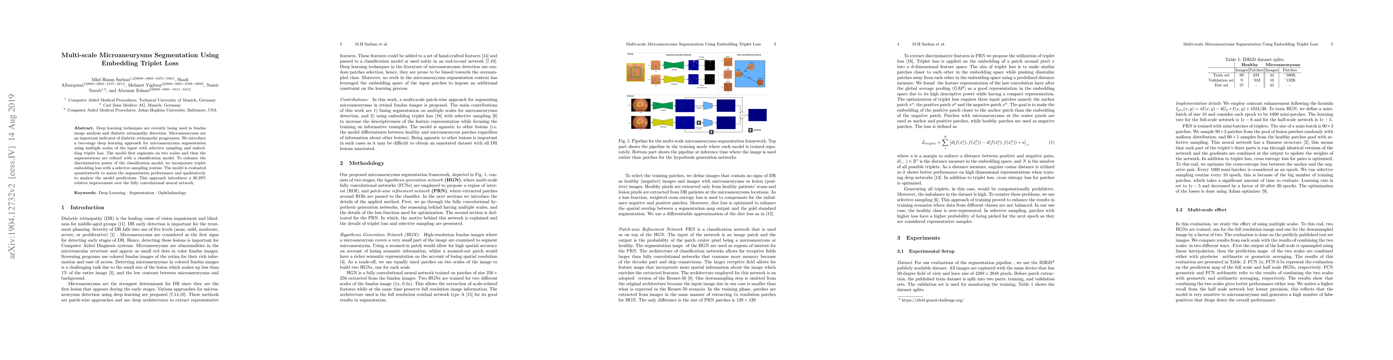 This paper proposes a two-stage deep learning method for segmenting microaneurysms in fundus images using multiple scales and embedding triplet loss. The approach shows a 30.29% relative improvement over existing fully convolutional neural networks in segmentation performance.