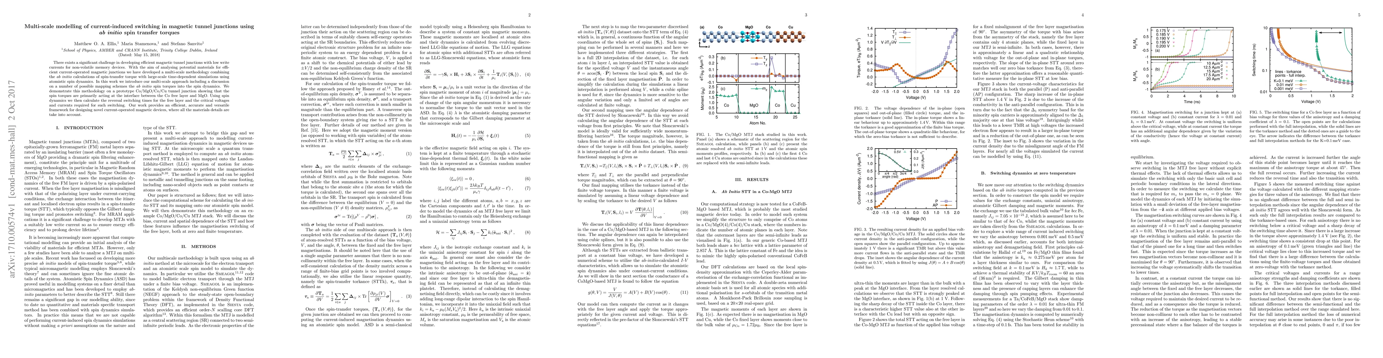 This paper proposes a multi-scale modelling approach that combines ab initio spin-transfer torque calculations with large-scale atomistic spin dynamics simulations to study current-induced switching in magnetic tunnel junctions. The methodology is demonstrated on a Co/MgO/Co/Cu junction, revealing that spin torques primarily act at the Co/MgO interface, and providing accurate predictions of switching times and critical currents for potential non-volatile memory devices.