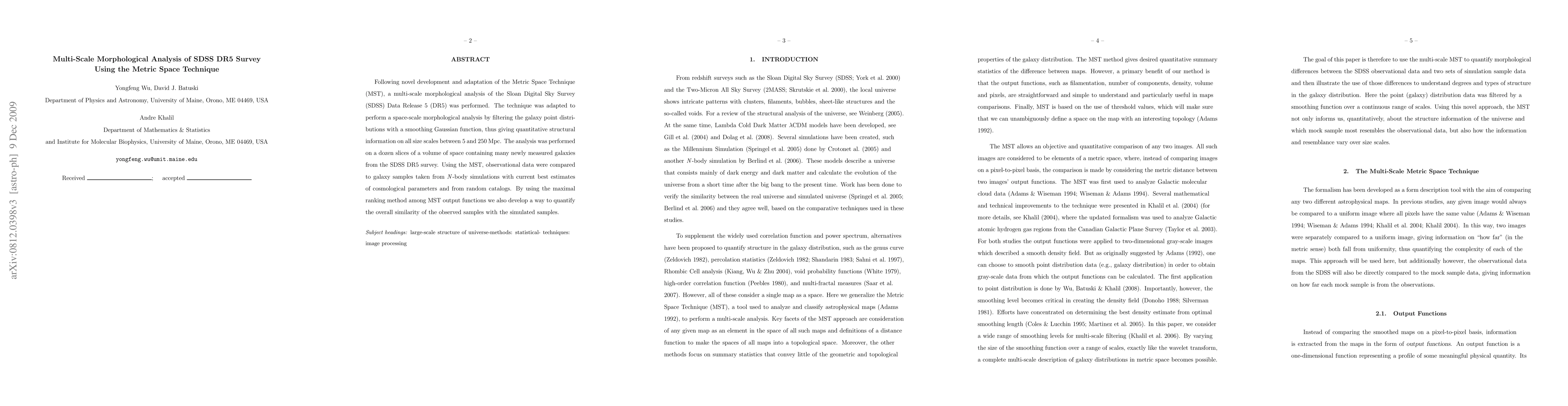Following novel development and adaptation of the Metric Space Technique (MST), a multi-scale morphological analysis of the Sloan Digital Sky Survey (SDSS) Data Release 5 (DR5) was performed. The technique was adapted to perform a space-scale morphological analysis by filtering the galaxy point distributions with a smoothing Gaussian function, thus giving quantitative structural information on all size scales between 5 and 250 Mpc. The analysis was performed on a dozen slices of a volume of space containing many newly measured galaxies from the SDSS DR5 survey. Using the MST, observational data were compared to galaxy samples taken from N-body simulations with current best estimates of cosmological parameters and from random catalogs. By using the maximal ranking method among MST output functions we also develop a way to quantify the overall similarity of the observed samples with the simulated samples.