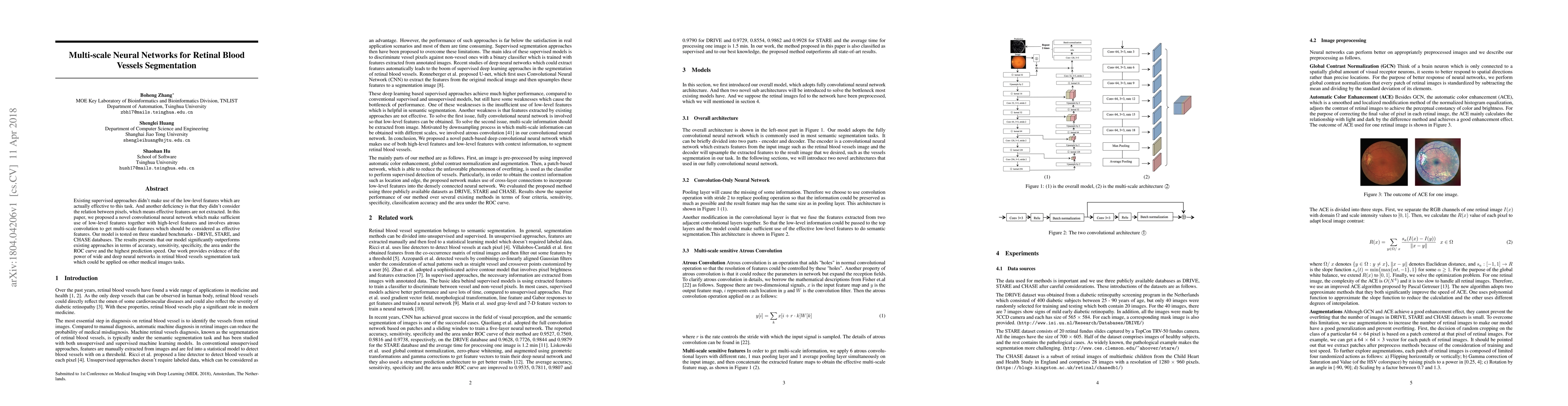 This paper proposes a novel convolutional neural network that leverages both low-level and high-level features, along with atrous convolution for multi-scale feature extraction, to segment retinal blood vessels. The model outperforms existing methods on three benchmarks in terms of accuracy, sensitivity, specificity, ROC curve, and speed.