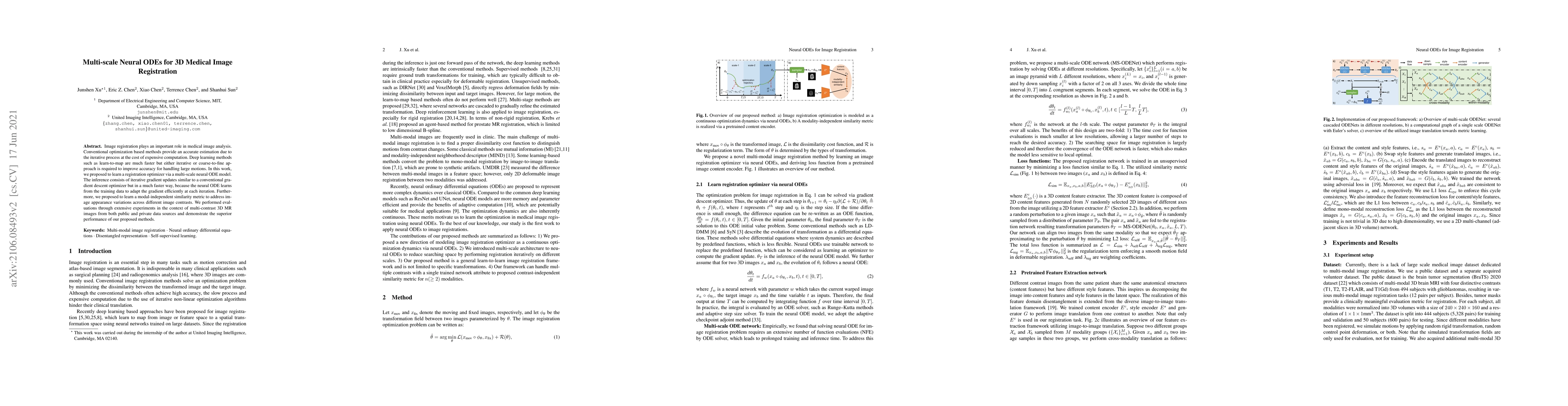 This paper proposes a multi-scale neural ODE model for efficient 3D medical image registration, achieving faster registration through learned gradient updates and a modal-independent similarity metric. Experiments on multi-contrast 3D MR images show superior performance compared to conventional methods.