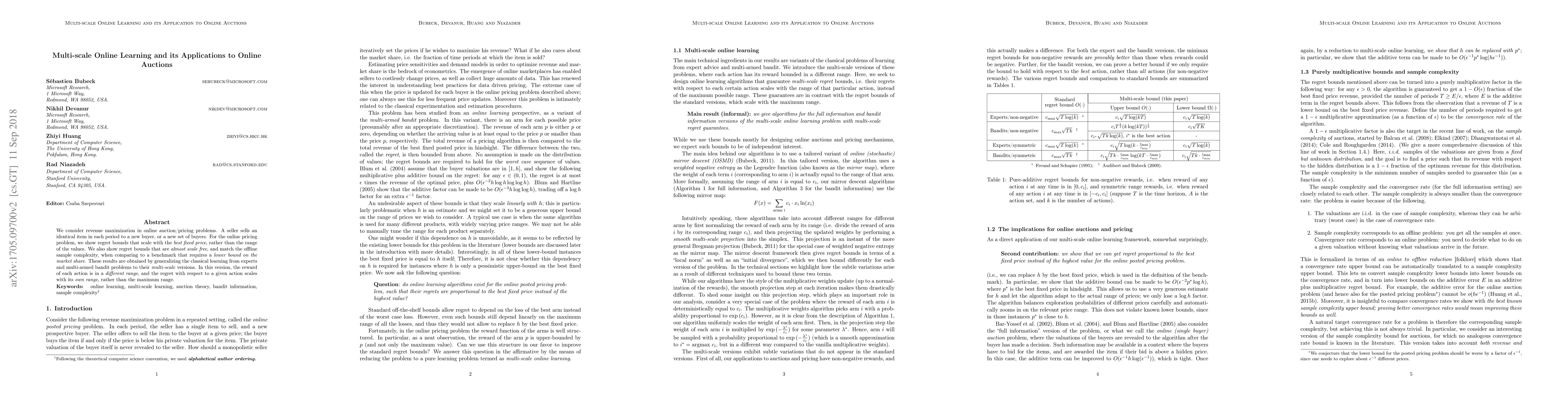 We consider revenue maximization in online auction/pricing problems. A seller sells an identical item in each period to a new buyer, or a new set of buyers. For the online posted pricing problem, we show regret bounds that scale with the best fixed price, rather than the range of the values. We also show regret bounds that are almost scale free, and match the offline sample complexity, when comparing to a benchmark that requires a lower bound on the market share. These results are obtained by generalizing the classical learning from experts and multi-armed bandit problems to their multi-scale versions. In this version, the reward of each action is in a different range, and the regret w.r.t. a given action scales with its own range, rather than the maximum range.