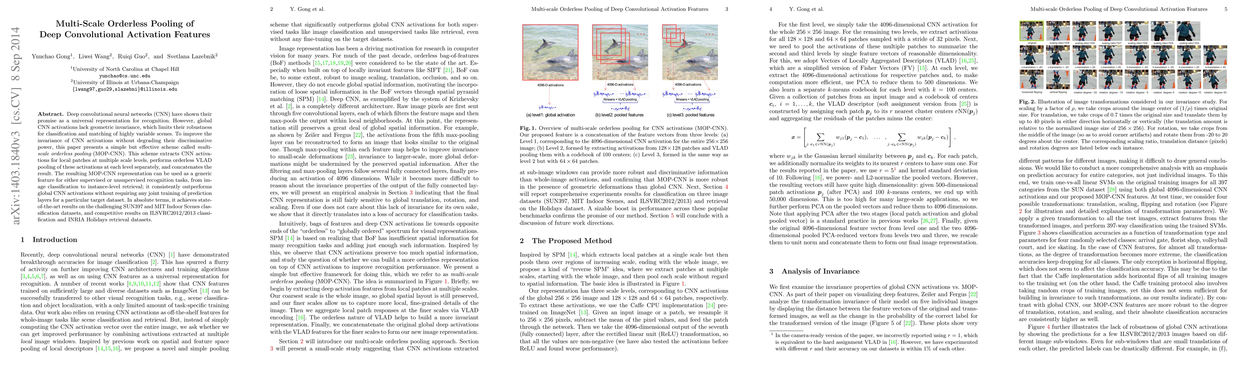Deep convolutional neural networks (CNN) have shown their promise as a universal representation for recognition. However, global CNN activations lack geometric invariance, which limits their robustness for classification and matching of highly variable scenes. To improve the invariance of CNN activations without degrading their discriminative power, this paper presents a simple but effective scheme called multi-scale orderless pooling (MOP-CNN). This scheme extracts CNN activations for local patches at multiple scale levels, performs orderless VLAD pooling of these activations at each level separately, and concatenates the result. The resulting MOP-CNN representation can be used as a generic feature for either supervised or unsupervised recognition tasks, from image classification to instance-level retrieval; it consistently outperforms global CNN activations without requiring any joint training of prediction layers for a particular target dataset. In absolute terms, it achieves state-of-the-art results on the challenging SUN397 and MIT Indoor Scenes classification datasets, and competitive results on ILSVRC2012/2013 classification and INRIA Holidays retrieval datasets.
