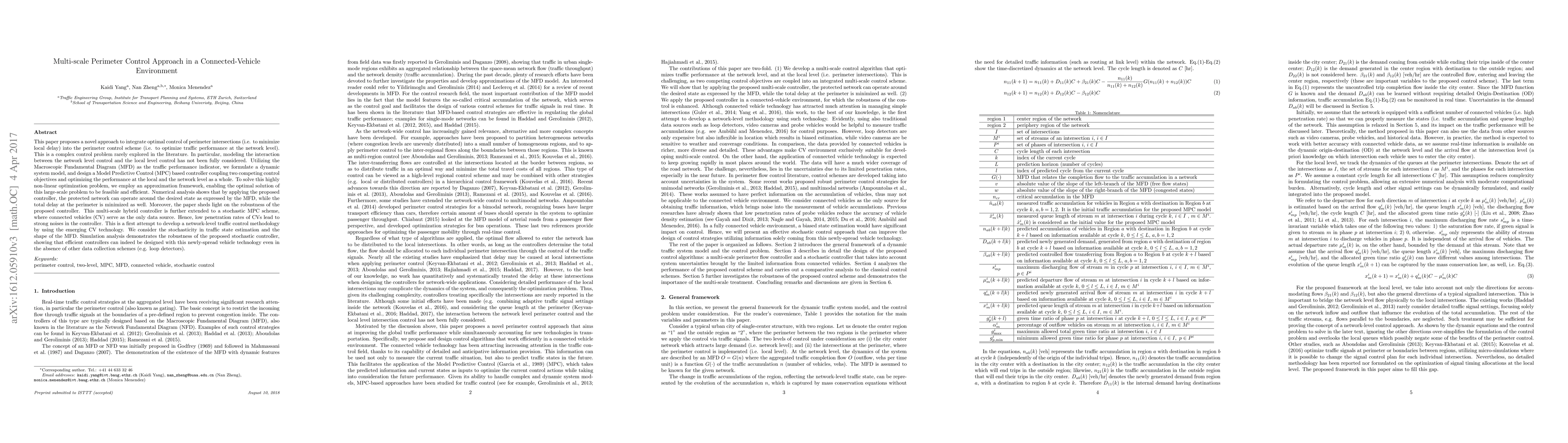 This paper proposes a novel approach to integrate optimal control of perimeter intersections (i.e. to minimize local delay) into the perimeter control scheme (i.e. to optimize traffic performance at the network level). This is a complex control problem rarely explored in the literature. In particular, modeling the interaction between the network level control and the local level control has not been fully considered. Utilizing the Macroscopic Fundamental Diagram (MFD) as the traffic performance indicator, we formulate a dynamic system model, and design a Model Predictive Control (MPC) based controller coupling two competing control objectives and optimizing the performance at the local and the network level as a whole. To solve this highly non-linear optimization problem, we employ an approximation framework, enabling the optimal solution of this large-scale problem to be feasible and efficient. Numerical analysis shows that by applying the proposed controller, the protected network can operate around the desired state as expressed by the MFD, while the total delay at the perimeter is minimized as well. Moreover, the paper sheds light on the robustness of the proposed controller. This multi-scale hybrid controller is further extended to a stochastic MPC scheme, where connected vehicles (CV) serve as the only data source. Hence, low penetration rates of CVs lead to strong noises in the controller. This is a first attempt to develop a network-level traffic control methodology by using the emerging CV technology. We consider the stochasticity in traffic state estimation and the shape of the MFD. Simulation analysis demonstrates the robustness of the proposed stochastic controller, showing that efficient controllers can indeed be designed with this newly-spread vehicle technology even in the absence of other data collection schemes (e.g. loop detectors).