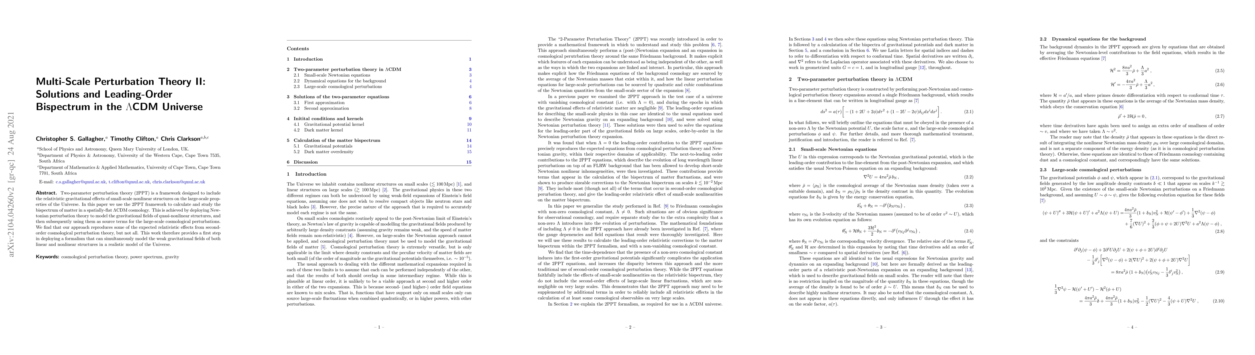 This paper employs two-parameter perturbation theory (2PPT) to calculate the leading-order bispectrum of matter in a $\Lambda$CDM cosmology, revealing some relativistic effects from second-order cosmological perturbation theory. The study uses Newtonian perturbation theory to model quasi-nonlinear structures and integrates them into large-scale cosmological perturbations.