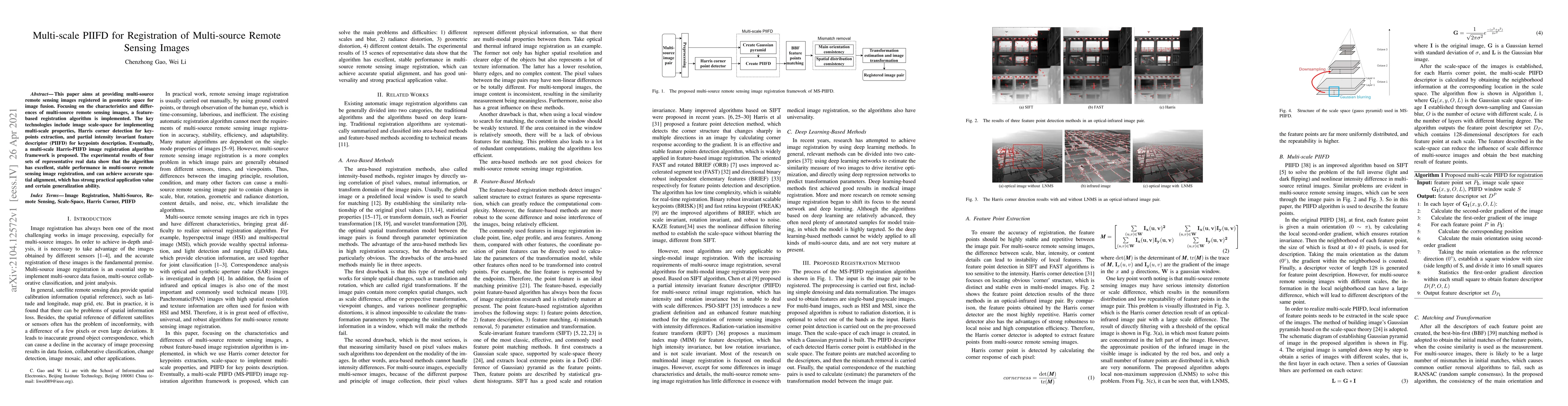 This paper aims at providing multi-source remote sensing images registered in geometric space for image fusion. Focusing on the characteristics and differences of multi-source remote sensing images, a feature-based registration algorithm is implemented. The key technologies include image scale-space for implementing multi-scale properties, Harris corner detection for keypoints extraction, and partial intensity invariant feature descriptor (PIIFD) for keypoints description. Eventually, a multi-scale Harris-PIIFD image registration algorithm framework is proposed. The experimental results of four sets of representative real data show that the algorithm has excellent, stable performance in multi-source remote sensing image registration, and can achieve accurate spatial alignment, which has strong practical application value and certain generalization ability.