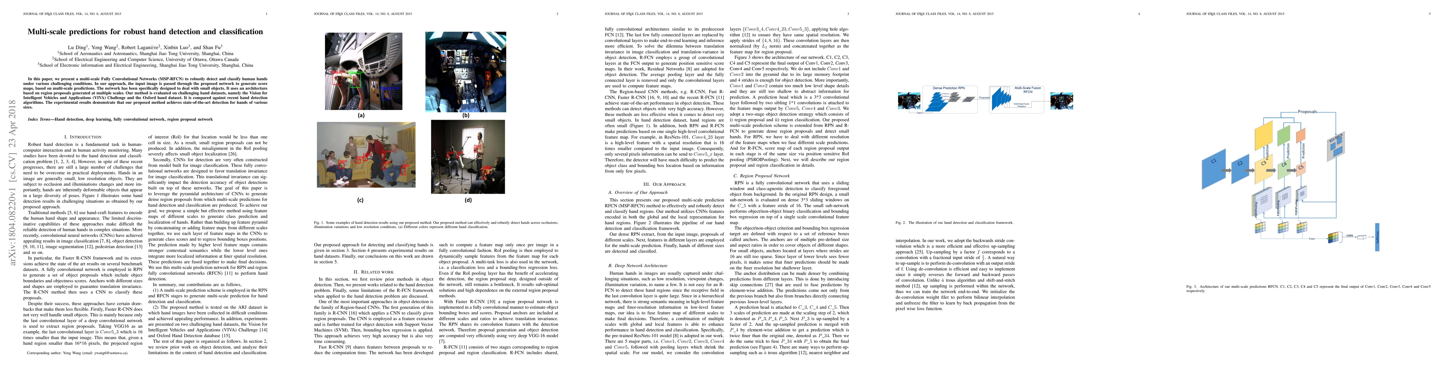 In this paper, we present a multi-scale Fully Convolutional Networks (MSP-RFCN) to robustly detect and classify human hands under various challenging conditions. In our approach, the input image is passed through the proposed network to generate score maps, based on multi-scale predictions. The network has been specifically designed to deal with small objects. It uses an architecture based on region proposals generated at multiple scales. Our method is evaluated on challenging hand datasets, namely the Vision for Intelligent Vehicles and Applications (VIVA) Challenge and the Oxford hand dataset. It is compared against recent hand detection algorithms. The experimental results demonstrate that our proposed method achieves state-of-the-art detection for hands of various sizes.