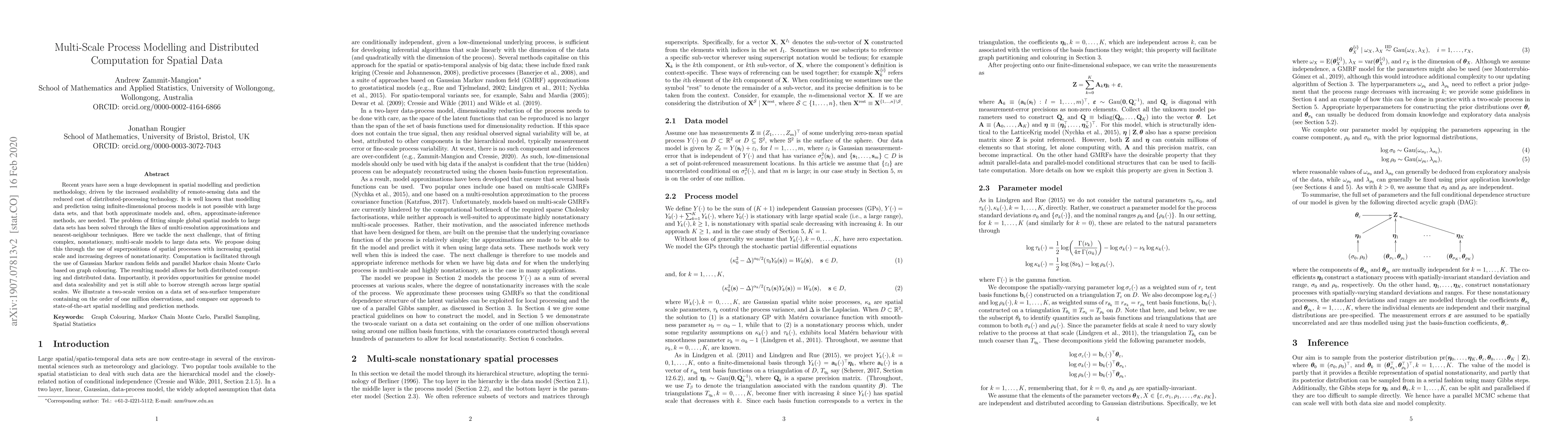 This paper proposes a multi-scale modelling approach for fitting complex, nonstationary spatial models to large datasets using superpositions of spatial processes and Gaussian Markov random fields. It leverages parallel computation techniques to enable distributed data and model scalability, demonstrated through a two-scale model applied to a sea-surface temperature dataset.