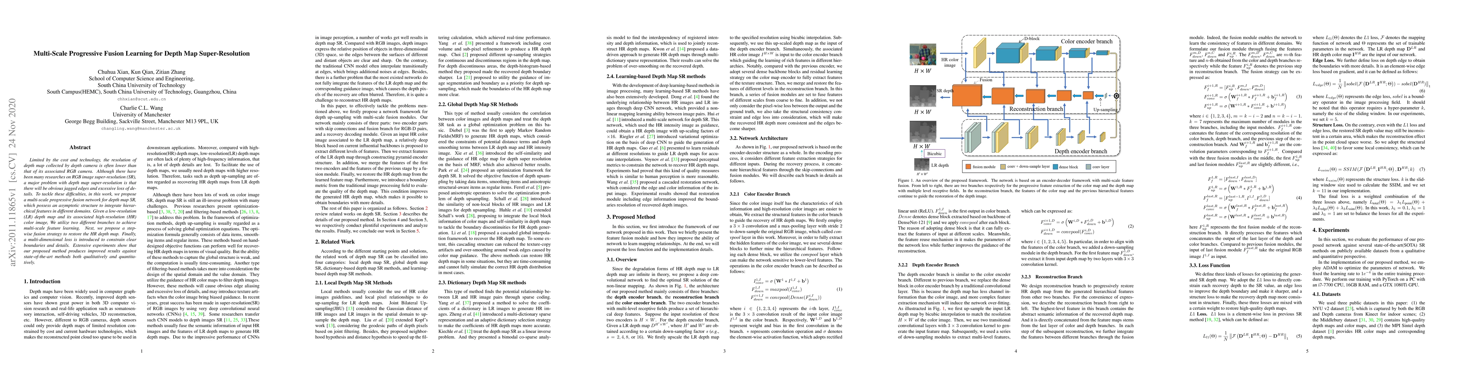 This paper proposes a multi-scale progressive fusion network for depth map super-resolution, addressing the issue of jagged edges and detail loss. The method integrates hierarchical features from low-resolution depth maps and high-resolution color images, employing a step-wise fusion strategy and multi-dimensional loss to achieve superior results compared to existing techniques.