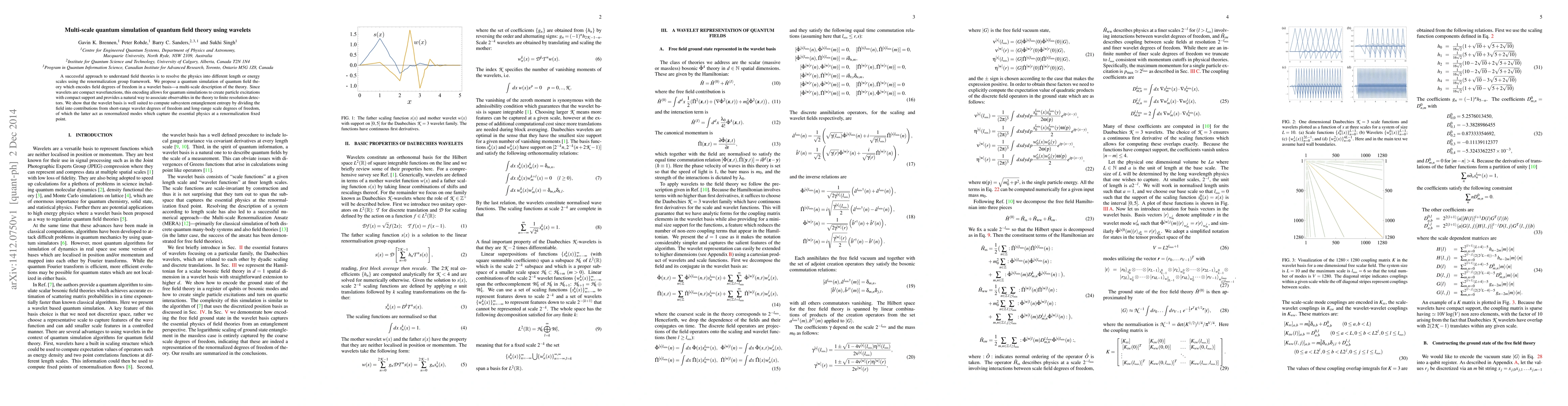 A successful approach to understand field theories is to resolve the physics into different length or energy scales using the renormalization group framework. We propose a quantum simulation of quantum field theory which encodes field degrees of freedom in a wavelet basis---a multi-scale description of the theory. Since wavelets are compact wavefunctions, this encoding allows for quantum simulations to create particle excitations with compact support and provides a natural way to associate observables in the theory to finite resolution detectors. We show that the wavelet basis is well suited to compute subsystem entanglement entropy by dividing the field into contributions from short-range wavelet degrees of freedom and long-range scale degrees of freedom, of which the latter act as renormalized modes which capture the essential physics at a renormalization fixed point.