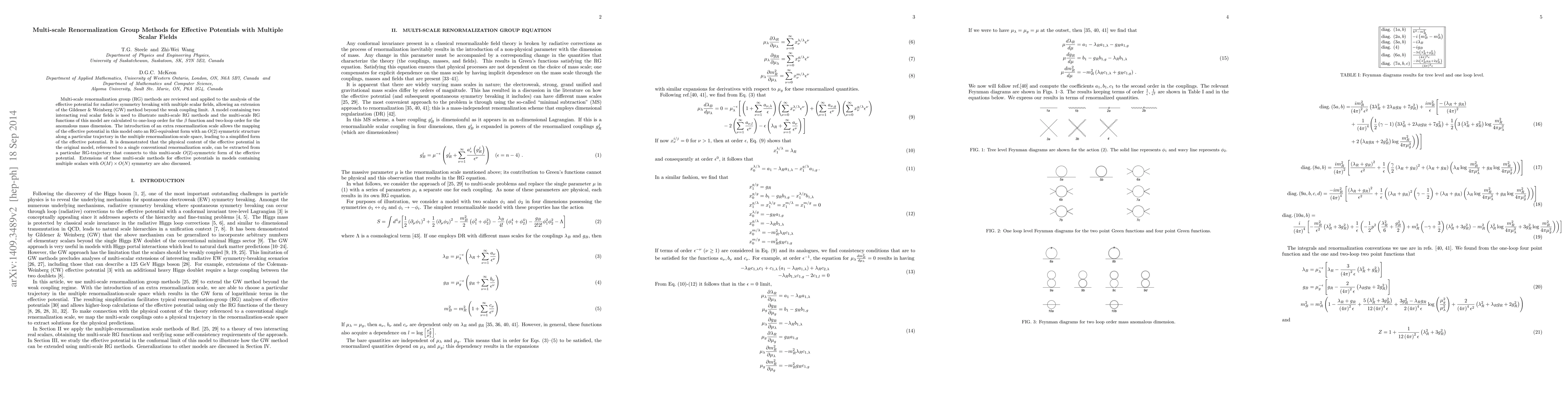 This paper reviews and applies multi-scale renormalization group methods to analyze effective potentials in models with multiple scalar fields, extending the Gildener & Weinberg method beyond the weak coupling limit. It demonstrates the method using a model with two interacting scalar fields, showing how an extra renormalization scale simplifies the effective potential through an O(2) symmetric structure.