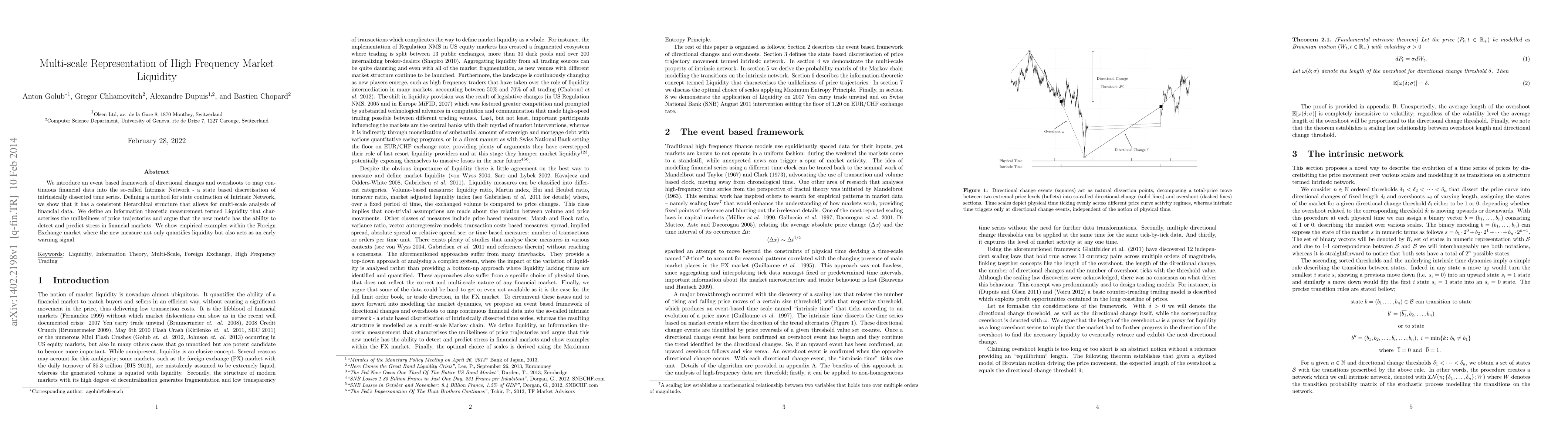 We introduce an event based framework of directional changes and overshoots to map continuous financial data into the so-called Intrinsic Network - a state based discretisation of intrinsically dissected time series. Defining a method for state contraction of Intrinsic Network, we show that it has a consistent hierarchical structure that allows for multi-scale analysis of financial data. We define an information theoretic measurement termed Liquidity that characterises the unlikeliness of price trajectories and argue that the new metric has the ability to detect and predict stress in financial markets. We show empirical examples within the Foreign Exchange market where the new measure not only quantifies liquidity but also acts as an early warning signal.