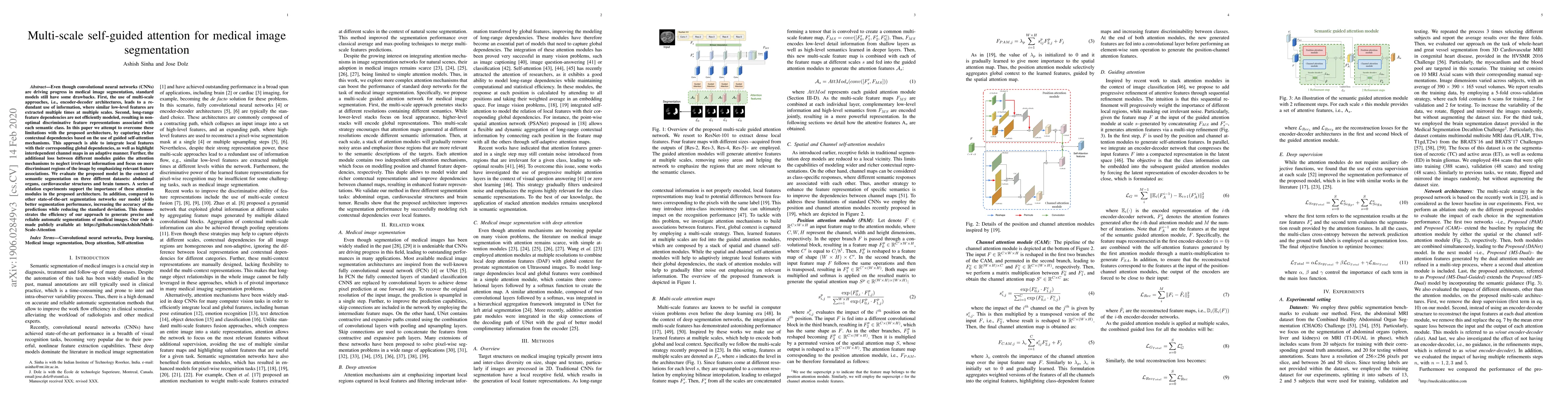 Even though convolutional neural networks (CNNs) are driving progress in medical image segmentation, standard models still have some drawbacks. First, the use of multi-scale approaches, i.e., encoder-decoder architectures, leads to a redundant use of information, where similar low-level features are extracted multiple times at multiple scales. Second, long-range feature dependencies are not efficiently modeled, resulting in non-optimal discriminative feature representations associated with each semantic class. In this paper we attempt to overcome these limitations with the proposed architecture, by capturing richer contextual dependencies based on the use of guided self-attention mechanisms. This approach is able to integrate local features with their corresponding global dependencies, as well as highlight interdependent channel maps in an adaptive manner. Further, the additional loss between different modules guides the attention mechanisms to neglect irrelevant information and focus on more discriminant regions of the image by emphasizing relevant feature associations. We evaluate the proposed model in the context of semantic segmentation on three different datasets: abdominal organs, cardiovascular structures and brain tumors. A series of ablation experiments support the importance of these attention modules in the proposed architecture. In addition, compared to other state-of-the-art segmentation networks our model yields better segmentation performance, increasing the accuracy of the predictions while reducing the standard deviation. This demonstrates the efficiency of our approach to generate precise and reliable automatic segmentations of medical images. Our code is made publicly available at https://github.com/sinAshish/Multi-Scale-Attention