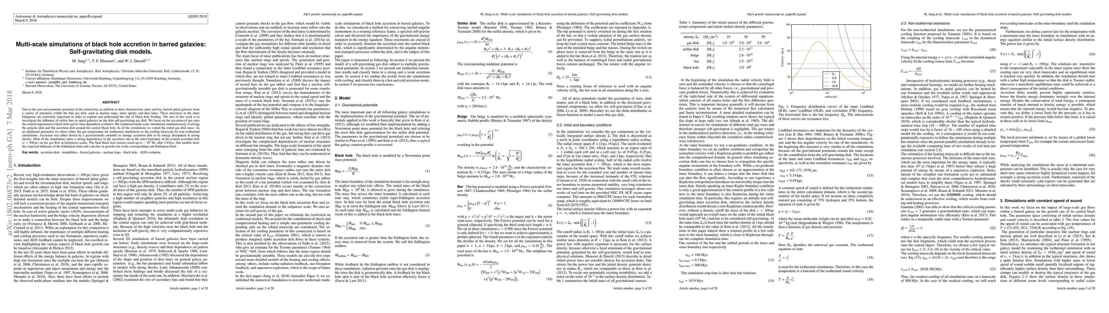Due to the non-axisymmetric potential of the central bar, barred spiral galaxies form, in addition to their characteristic arms and bar, a variety of structures within the thin gas disk, like nuclear rings, inner spirals and dust-lanes. These structures in the inner kiloparsec are most important to explain and understand the rate of black hole feeding. The aim of this work is to investigate the influence of stellar bars in spiral galaxies on the thin self-gravitating gas disk. We focus on the accretion of gas onto the central supermassive black hole and its time-dependent evolution. We conduct multi-scale simulations simultaneously resolving the galactic disk and the accretion disk around the central black-hole. We vary in all simulations the initial gas disk mass. As additional parameter we choose either the gas temperature for isothermal simulations or the cooling timescale in case of non-isothermal simulations. Accretion is either driven by a gravitationally unstable or clumpy accretion disk or by energy dissipation in strong shocks. Most simulations show a strong dependence of the accretion rate at the outer boundary of the central accretion disk ($r< 300~\mathrm{pc}$) on the gas flow at kiloparsec scales. The final black hole masses reach up to $\sim 10^9 M_\odot$ after $1.6~\mathrm{Gyr}$. Our models show the expected influence of the Eddington limit and a decline in growth rate at the corresponding sub-Eddington limit.