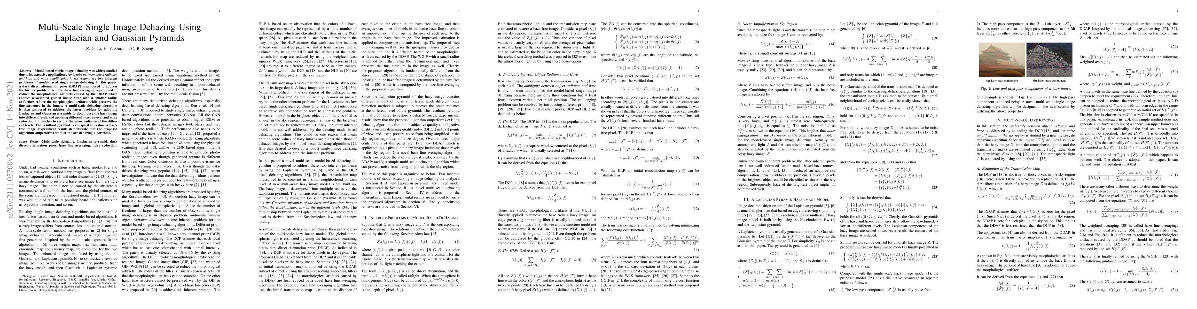 This paper proposes a multi-scale dehazing algorithm using Laplacian and Gaussian pyramids to decompose and restore a hazy image at different levels, addressing inherent problems like ambiguity between object radiance and haze, and noise amplification. The method combines a dark direct attenuation prior and haze line averaging to enhance fine structures and reduce artifacts.
