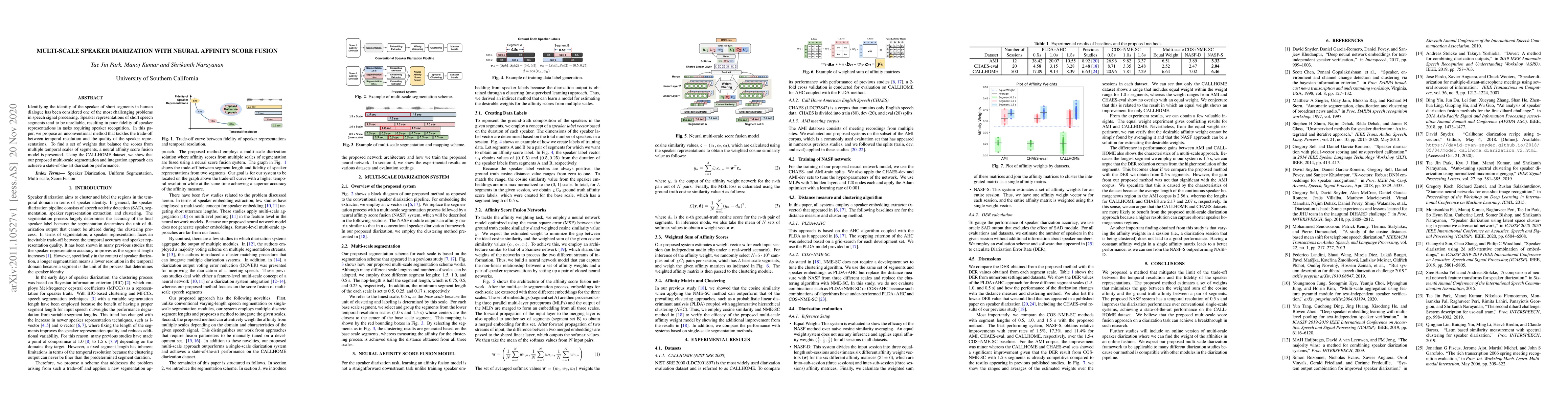 This paper presents a novel neural affinity score fusion model for multi-scale speaker diarization, balancing temporal resolution and speaker representation quality. The proposed method achieves state-of-the-art performance on the CALLHOME dataset, demonstrating improved speaker recognition in short dialogue segments.