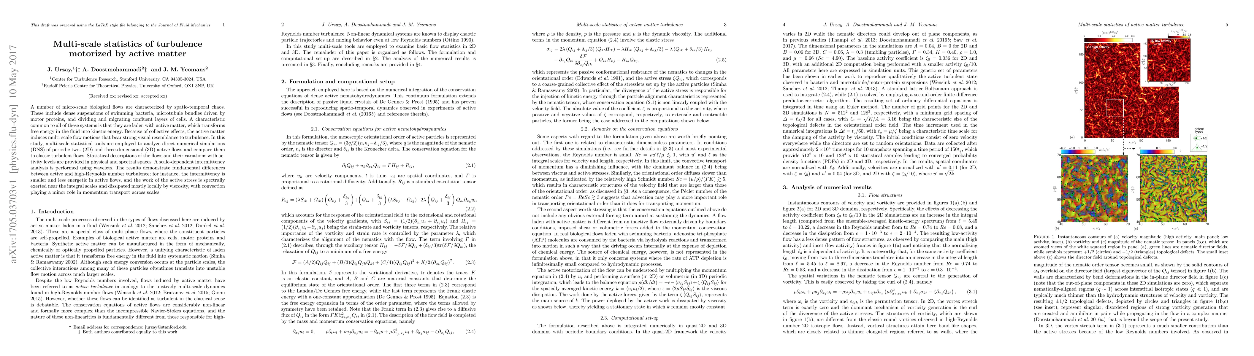 A number of micro-scale biological flows are characterized by spatio-temporal chaos. These include dense suspensions of swimming bacteria, microtubule bundles driven by motor proteins, and dividing and migrating confluent layers of cells. A characteristic common to all of these systems is that they are laden with active matter, which transforms free energy in the fluid into kinetic energy. Because of collective effects, the active matter induces multi-scale flow motions that bear strong visual resemblance to turbulence. In this study, multi-scale statistical tools are employed to analyze direct numerical simulations (DNS) of periodic two- (2D) and three-dimensional (3D) active flows and compare them to classic turbulent flows. Statistical descriptions of the flows and their variations with activity levels are provided in physical and spectral spaces. A scale-dependent intermittency analysis is performed using wavelets. The results demonstrate fundamental differences between active and high-Reynolds number turbulence; for instance, the intermittency is smaller and less energetic in active flows, and the work of the active stress is spectrally exerted near the integral scales and dissipated mostly locally by viscosity, with convection playing a minor role in momentum transport across scales.