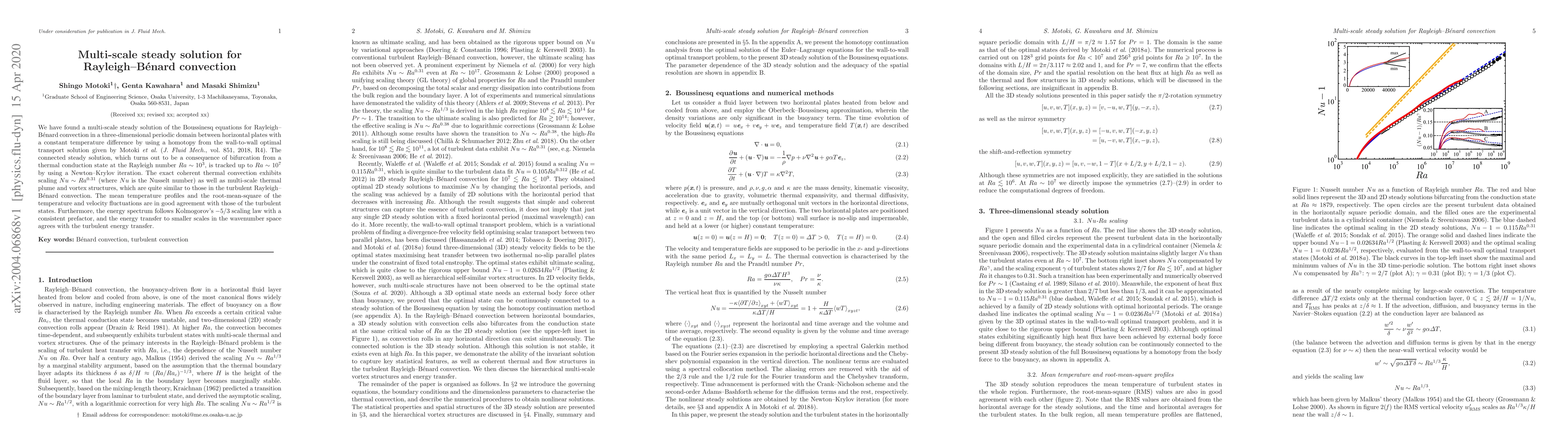 This paper presents a multi-scale steady solution for Rayleigh-Bénard convection derived from the Boussinesq equations, tracking the solution from $Ra\sim10^{3}$ to $Ra\sim10^{7}$. The solution exhibits scaling $Nu\sim Ra^{0.31}$ and features similar thermal plume and vortex structures to turbulent convection.