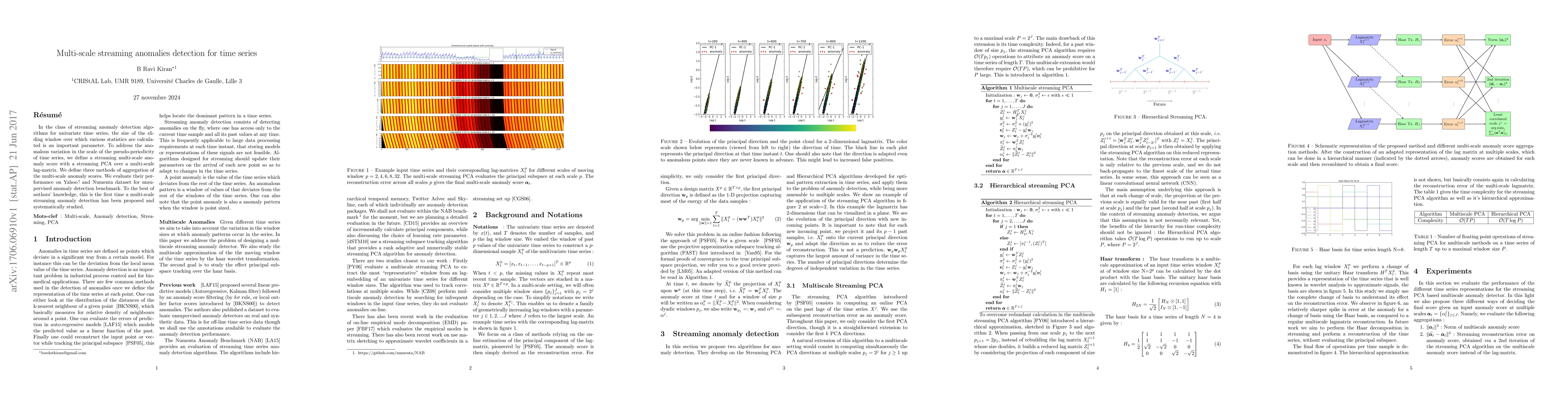 This paper proposes a novel multi-scale streaming anomaly detection method for univariate time series using a multi-scale lag-matrix and streaming PCA. The authors evaluate three aggregation methods for anomaly scores and demonstrate their performance on benchmark datasets.