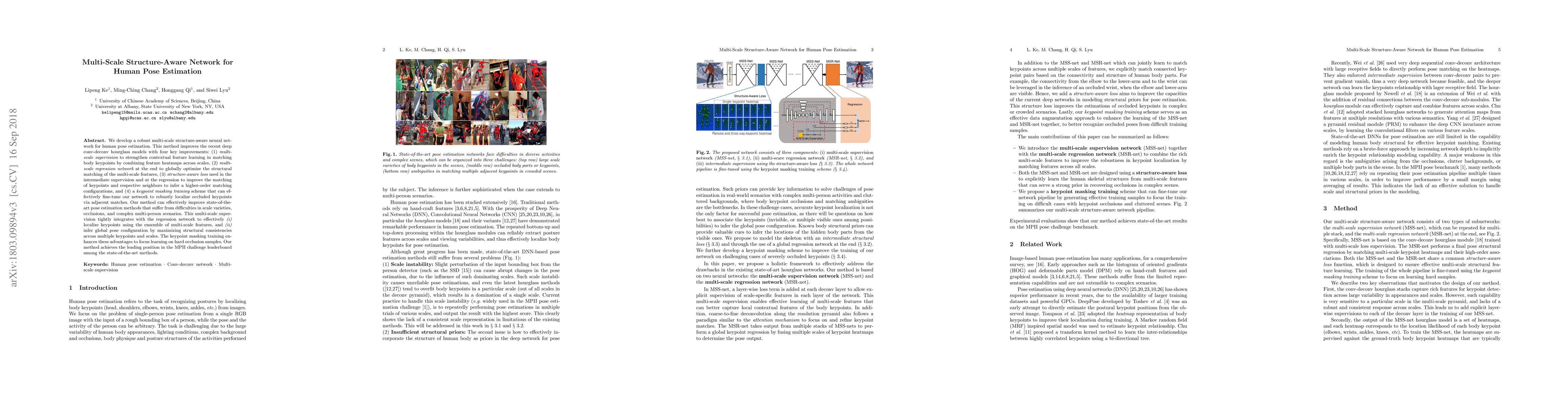 This paper proposes a multi-scale structure-aware neural network that enhances human pose estimation through multi-scale supervision, a regression network, structure-aware loss, and keypoint masking training, achieving top results in the MPII challenge. The method effectively localizes keypoints and infers global pose configurations by leveraging multi-scale features and focusing on occlusions.