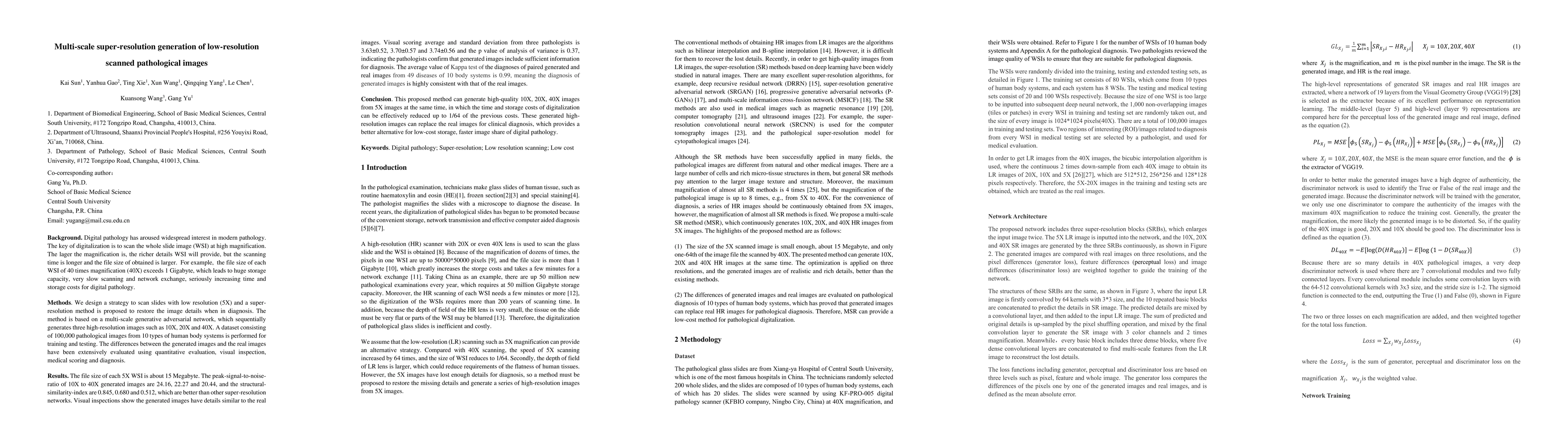 A multi-scale super-resolution generation method is proposed to restore image details from low-resolution scanned pathological images.
