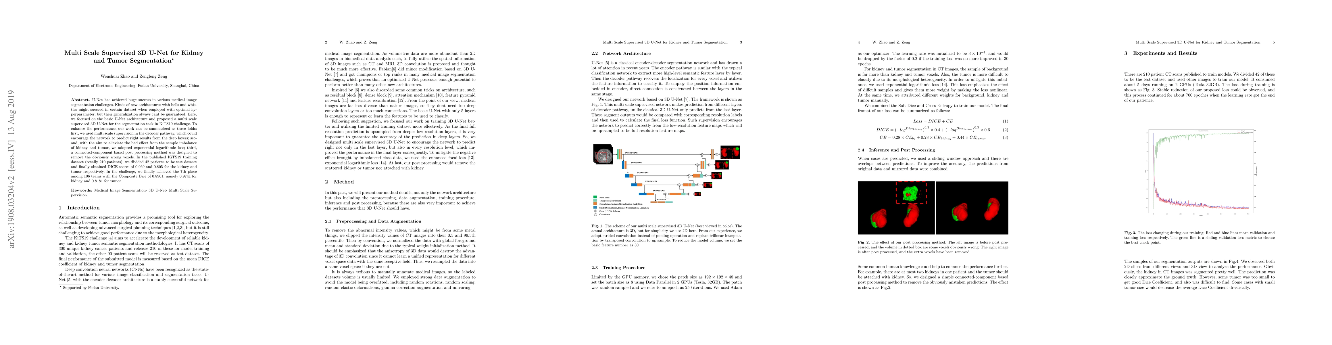 This paper proposes a multi scale supervised 3D U-Net for kidney and tumor segmentation, achieving high DICE scores of 0.969 and 0.805 respectively in the KiTS19 challenge. The approach includes multi scale supervision, exponential logarithmic loss to handle sample imbalance, and post-processing to refine results.