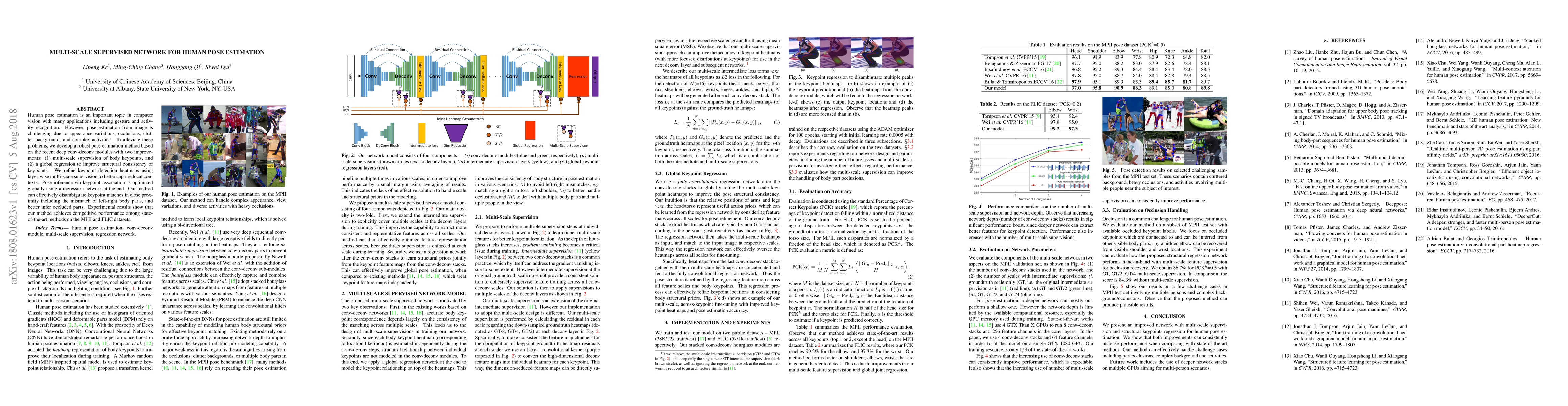 This paper proposes a multi-scale supervised network for human pose estimation, enhancing keypoint detection via multi-scale supervision and optimizing pose inference with global regression for better structural consistency. Experimental results indicate competitive performance on MPII and FLIC datasets.