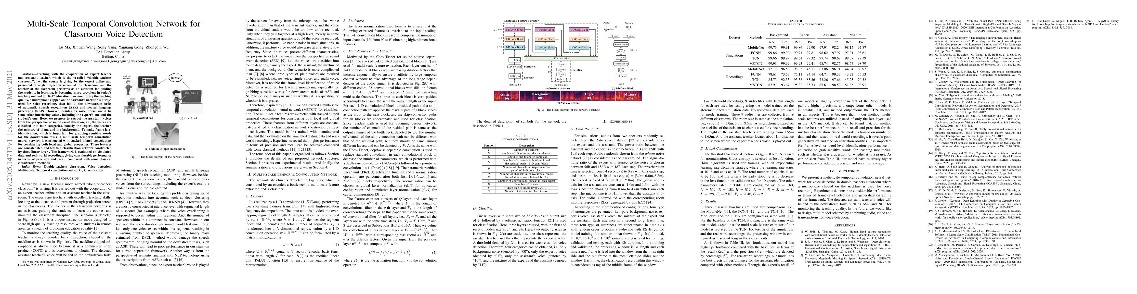 Teaching with the cooperation of expert teacher and assistant teacher, which is the so-called "double-teachers classroom", i.e., the course is giving by the expert online and presented through projection screen at the classroom, and the teacher at the classroom performs as an assistant for guiding the students in learning, is becoming more prevalent in today's teaching method for K-12 education. For monitoring the teaching quality, a microphone clipped on the assistant's neckline is always used for voice recording, then fed to the downstream tasks of automatic speech recognition (ASR) and neural language processing (NLP). However, besides its voice, there would be some other interfering voices, including the expert's one and the student's one. Here, we propose to extract the assistant' voices from the perspective of sound event detection, i.e., the voices are classified into four categories, namely the expert, the teacher, the mixture of them, and the background. To make frame-level identification, which is important for grabbing sensitive words for the downstream tasks, a multi-scale temporal convolution neural network is constructed with stacked dilated convolutions for considering both local and global properties. These features are concatenated and fed to a classification network constructed by three linear layers. The framework is evaluated on simulated data and real-world recordings, giving considerable performance in terms of precision and recall, compared with some classical classification methods.