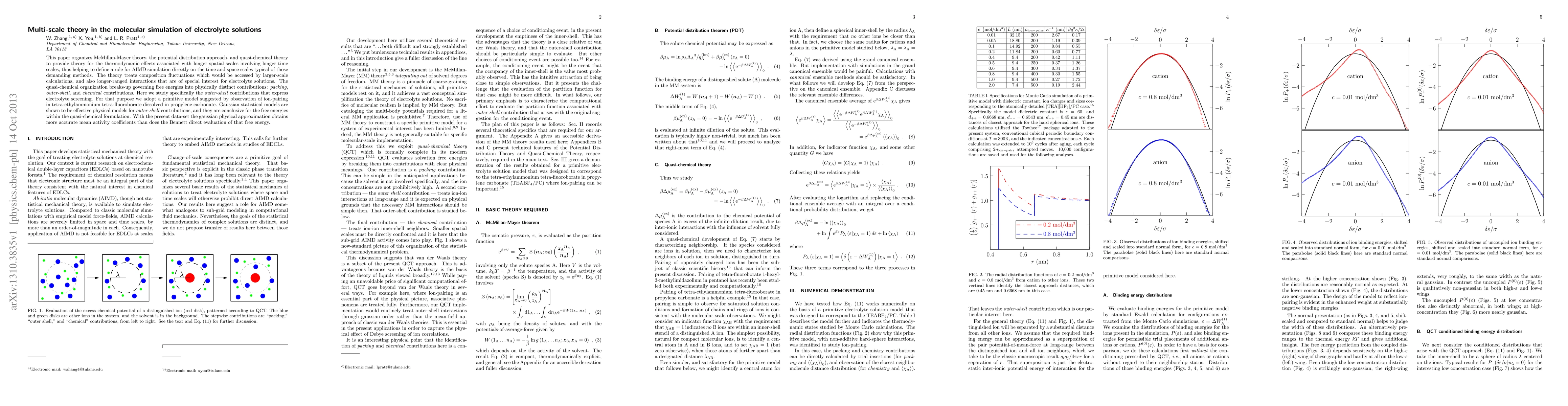 This paper organizes McMillan-Mayer theory, the potential distribution approach, and quasi-chemical theory to provide theory for the thermodynamic effects associated with longer spatial scales involving longer time scales, thus helping to define a role for AIMD simulation directly on the time and space scales typical of those demanding methods. The theory treats composition fluctuations which would be accessed by larger-scale calculations, and also longer-ranged interactions that are of special interest for electrolyte solutions. The quasi-chemical organization breaks-up governing free energies into physically distinct contributions: packing, outer-shell, and chemical contributions. Here we study specifically the outer-shell contributions that express electrolyte screening. For that purpose we adopt a primitive model suggested by observation of ion-pairing in tetra-ethylammonium tetra-fluoroborate dissolved in propylene carbonate. Gaussian statistical models are shown to be effective physical models for outer-shell contributions, and they are conclusive for the free energies within the quasi-chemical formulation. With the present data-set the gaussian physical approximation obtains more accurate mean activity coefficients than does the Bennett direct evaluation of that free energy.