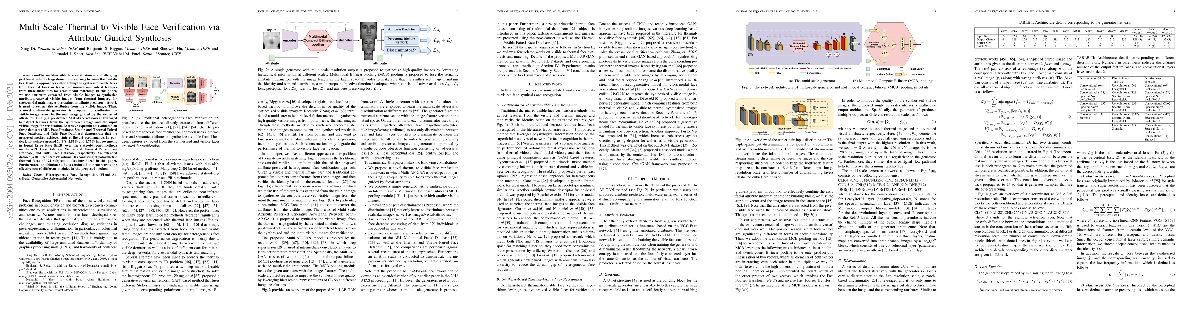 This paper proposes a method for multi-scale thermal-to-visible face verification using attribute-guided synthesis, achieving state-of-the-art performance by synthesizing visible faces from thermal imagery guided by extracted attributes, and leveraging a VGG-Face network for feature extraction. The method shows significant improvements in Equal Error Rate on multiple datasets.