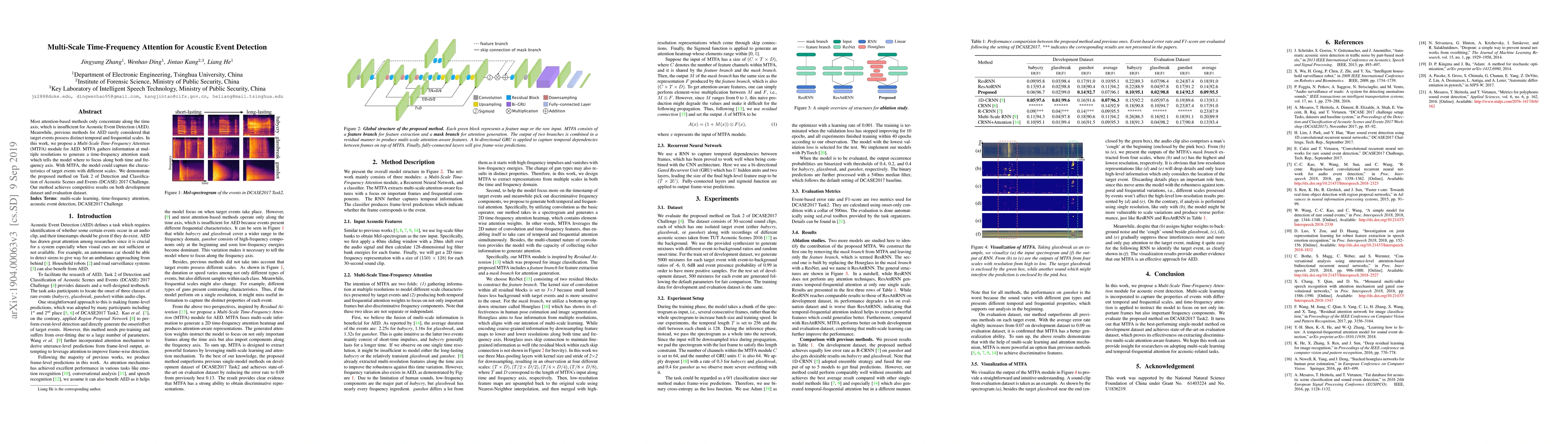 Most attention-based methods only concentrate along the time axis, which is insufficient for Acoustic Event Detection (AED). Meanwhile, previous methods for AED rarely considered that target events possess distinct temporal and frequential scales. In this work, we propose a Multi-Scale Time-Frequency Attention (MTFA) module for AED. MTFA gathers information at multiple resolutions to generate a time-frequency attention mask which tells the model where to focus along both time and frequency axis. With MTFA, the model could capture the characteristics of target events with different scales. We demonstrate the proposed method on Task 2 of Detection and Classification of Acoustic Scenes and Events (DCASE) 2017 Challenge. Our method achieves competitive results on both development dataset and evaluation dataset.