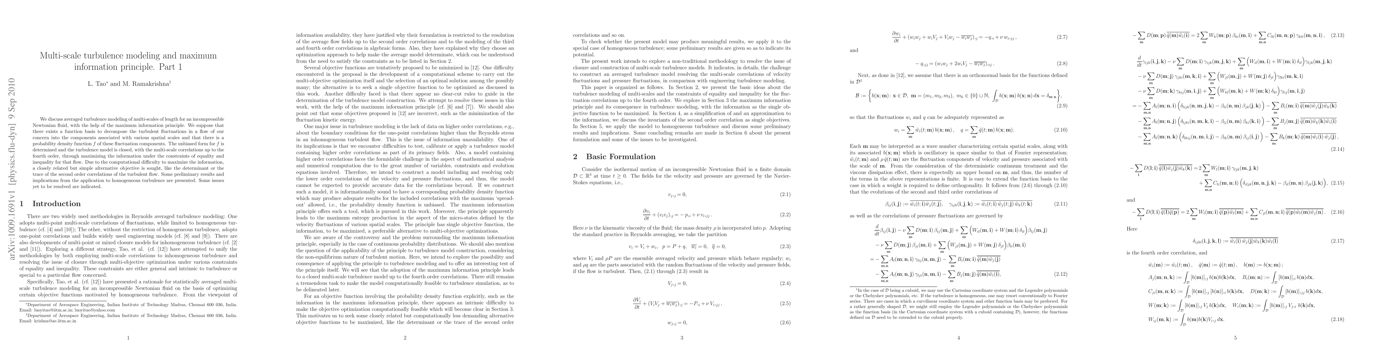 We discuss averaged turbulence modeling of multi-scales of length for an incompressible Newtonian fluid, with the help of the maximum information principle. We suppose that there exists a function basis to decompose the turbulent fluctuations in a flow of our concern into the components associated with various spatial scales and that there is a probability density function $\pdf$ of these fluctuation components. The unbiased form for $\pdf$ is determined and the turbulence model is closed, with the multi-scale correlations up to the fourth order, through maximizing the information under the constraints of equality and inequality for that flow. Due to the computational difficulty to maximize the information, a closely related but simple alternative objective is sought, like the determinant or the trace of the second order correlations of the turbulent flow. Some preliminary results and implications from the application to homogeneous turbulence are presented. Some issues yet to be resolved are indicated.