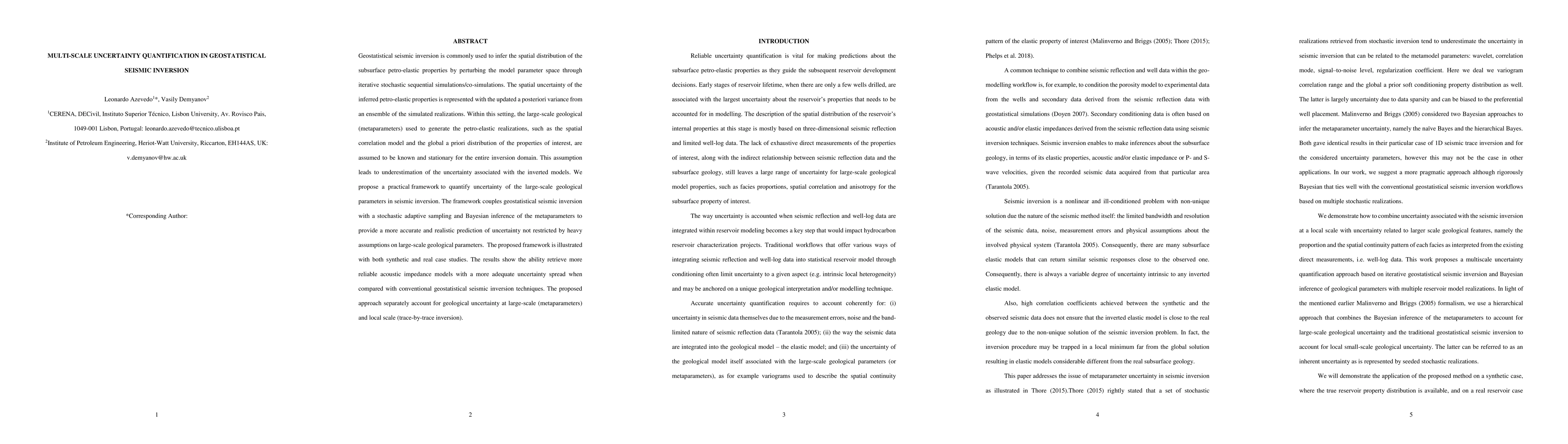 This paper proposes a framework for multi-scale uncertainty quantification in geostatistical seismic inversion, integrating stochastic adaptive sampling and Bayesian inference to better estimate uncertainties in large-scale geological parameters. The results demonstrate improved accuracy and reliability in predicting subsurface petro-elastic properties compared to conventional methods.