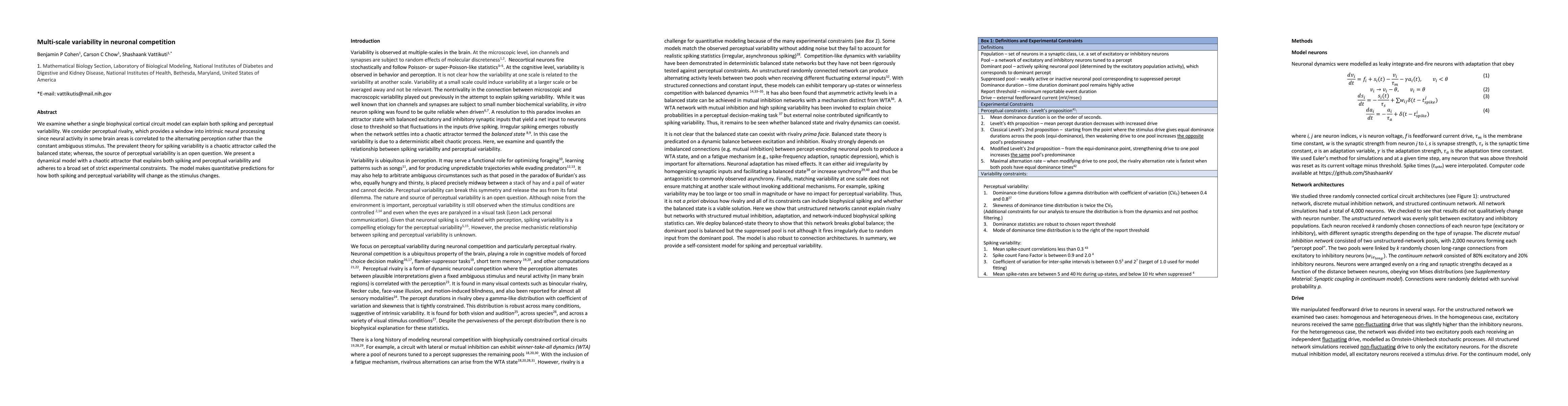We examine whether a single biophysical cortical circuit model can explain both spiking and perceptual variability. We consider perceptual rivalry, which provides a window into intrinsic neural processing since neural activity in some brain areas is correlated to the alternating perception rather than the constant ambiguous stimulus. The prevalent theory for spiking variability is a chaotic attractor called the balanced state; whereas, the source of perceptual variability is an open question. We present a dynamical model with a chaotic attractor that explains both spiking and perceptual variability and adheres to a broad set of strict experimental constraints. The model makes quantitative predictions for how both spiking and perceptual variability will change as the stimulus changes.