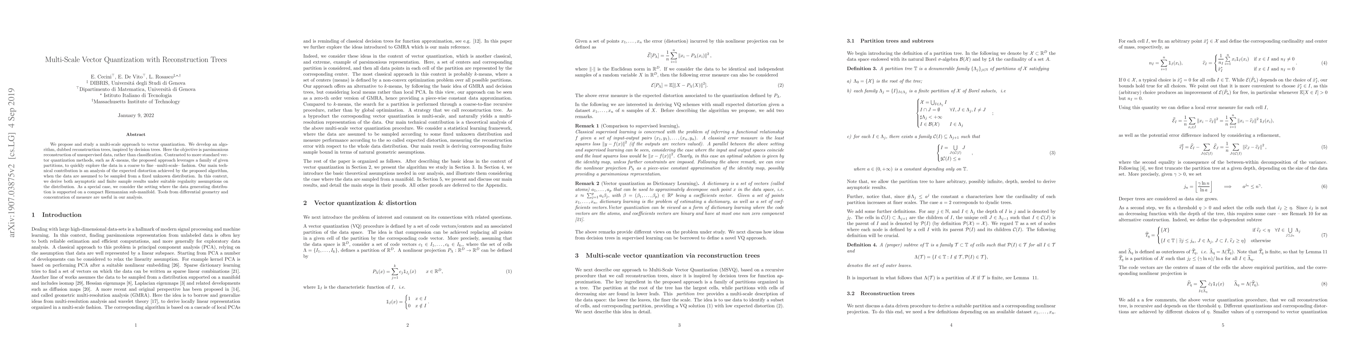 We propose and study a multi-scale approach to vector quantization. We develop an algorithm, dubbed reconstruction trees, inspired by decision trees. Here the objective is parsimonious reconstruction of unsupervised data, rather than classification. Contrasted to more standard vector quantization methods, such as K-means, the proposed approach leverages a family of given partitions, to quickly explore the data in a coarse to fine-- multi-scale-- fashion. Our main technical contribution is an analysis of the expected distortion achieved by the proposed algorithm, when the data are assumed to be sampled from a fixed unknown distribution. In this context, we derive both asymptotic and finite sample results under suitable regularity assumptions on the distribution. As a special case, we consider the setting where the data generating distribution is supported on a compact Riemannian sub-manifold. Tools from differential geometry and concentration of measure are useful in our analysis.