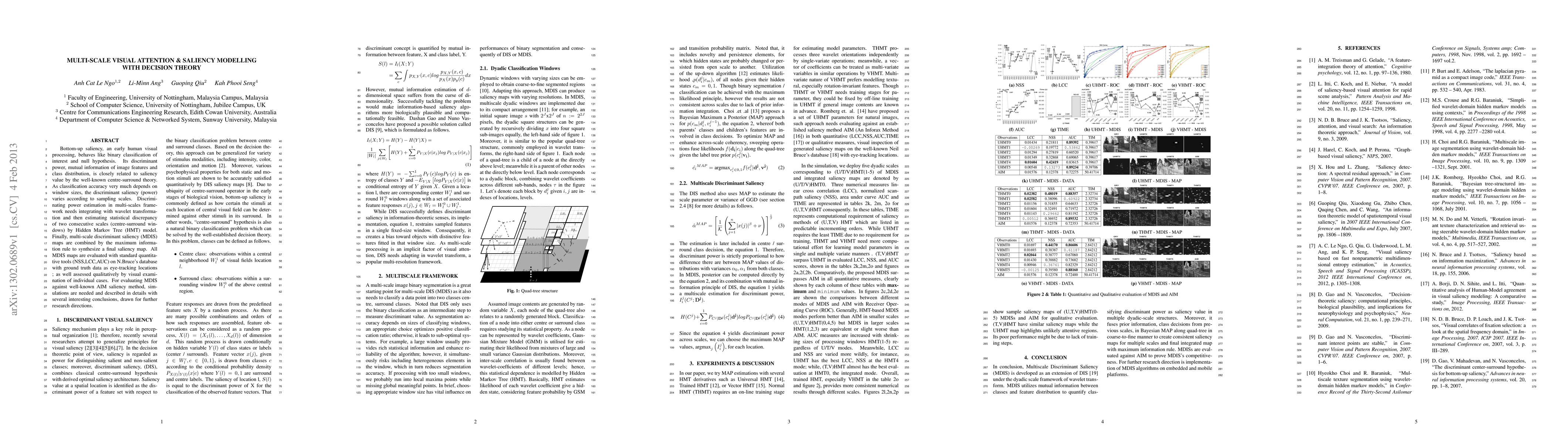 This paper proposes a multi-scale visual attention model using decision theory to estimate discriminant saliency across different scales, integrating wavelet transformation and Hidden Markov Tree (HMT) for statistical discrepancy. The final saliency map is synthesized using maximum information rule and evaluated against standard metrics and eye-tracking data.