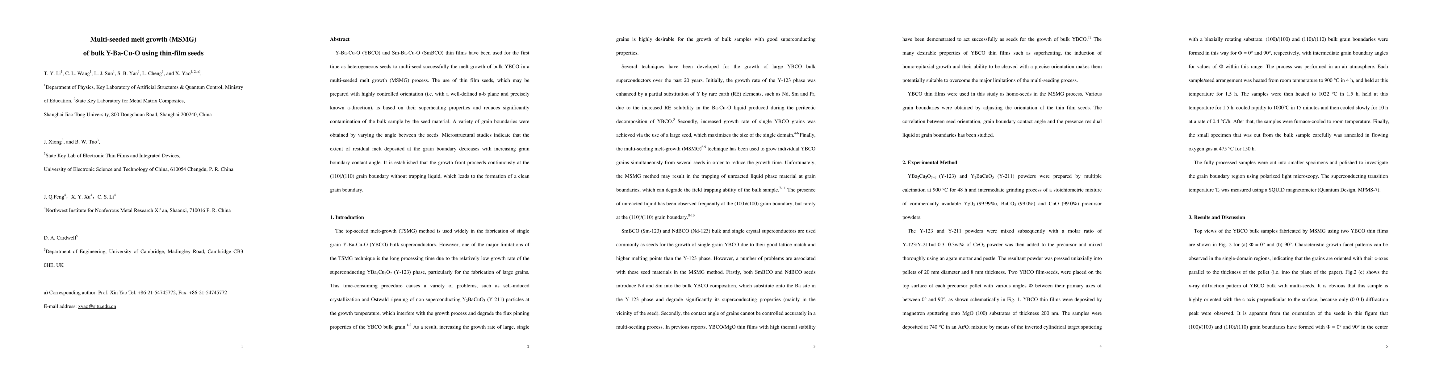 Y-Ba-Cu-O (YBCO) and Sm-Ba-Cu-O (SmBCO) thin films have been used for the first time as heterogeneous seeds to multi-seed successfully the melt growth of bulk YBCO in a multi-seeded melt growth (MSMG) process. The use of thin film seeds, which may be prepared with highly controlled orientation (i.e. with a well-defined a-b plane and precisely known a-direction), is based on their superheating properties and reduces significantly contamination of the bulk sample by the seed material. A variety of grain boundaries were obtained by varying the angle between the seeds. Microstructural studies indicate that the extent of residual melt deposited at the grain boundary decreases with increasing grain boundary contact angle. It is established that the growth front proceeds continuously at the (110)/(110) grain boundary without trapping liquid, which leads to the formation of a clean grain boundary.