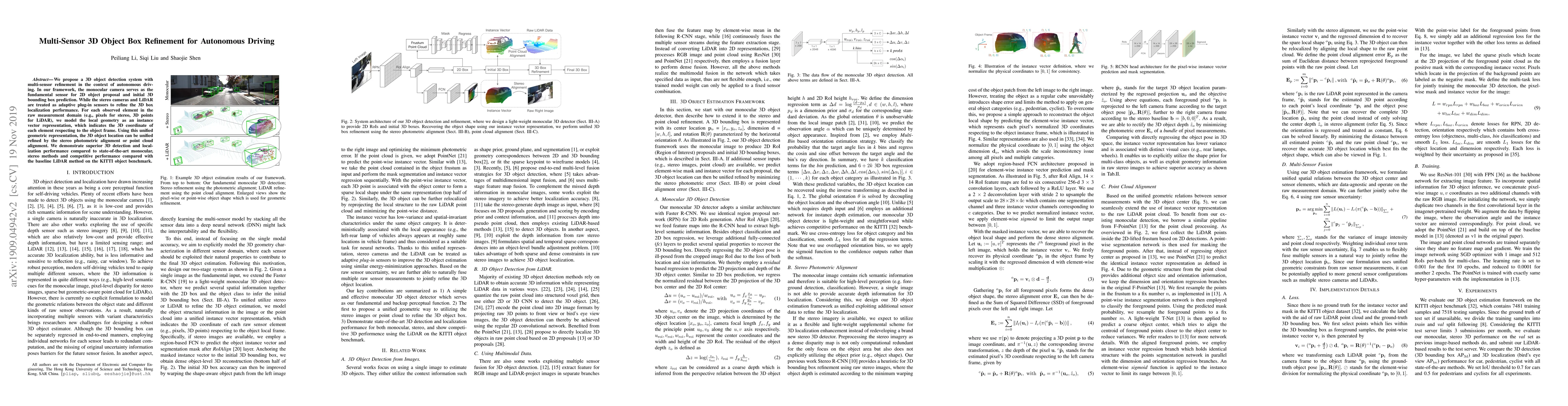 This research proposes a multi-sensor refinement system for 3D object detection in autonomous driving, using a monocular camera for initial predictions and stereo cameras and LiDAR for refinement. The system demonstrates superior performance compared to monocular and stereo methods, and competitive results against LiDAR baselines on the KITTI benchmark.