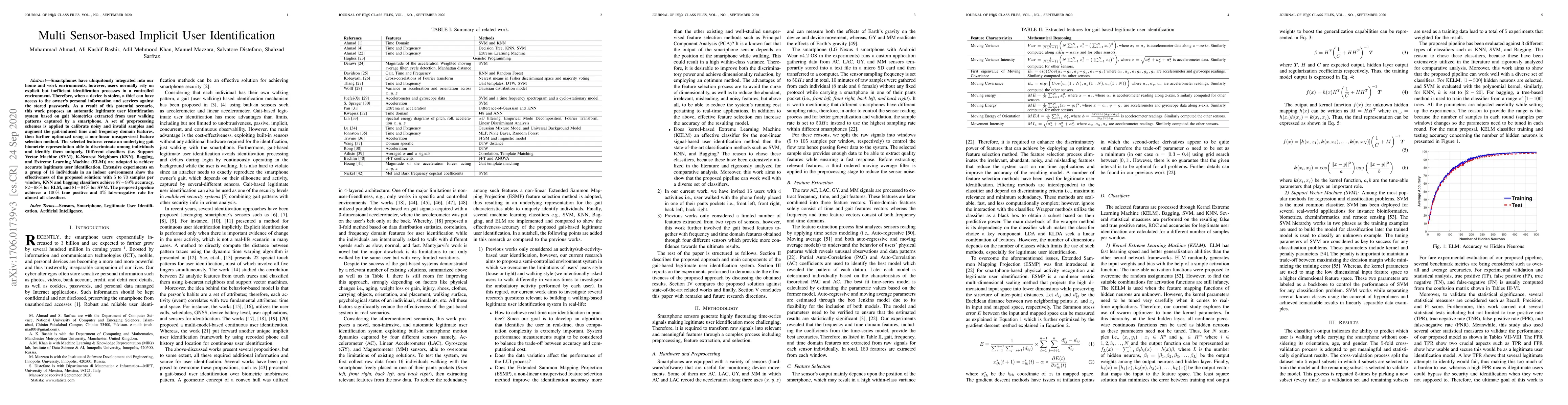 Smartphones have ubiquitously integrated into our home and work environments, however, users normally rely on explicit but inefficient identification processes in a controlled environment. Therefore, when a device is stolen, a thief can have access to the owner's personal information and services against the stored passwords. As a result of this potential scenario, this work proposes an automatic legitimate user identification system based on gait biometrics extracted from user walking patterns captured by a smartphone. A set of preprocessing schemes is applied to calibrate noisy and invalid samples and augment the gait-induced time and frequency domain features, then further optimized using a non-linear unsupervised feature selection method. The selected features create an underlying gait biometric representation able to discriminate among individuals and identify them uniquely. Different classifiers (i.e. Support Vector Machine (SVM), K-Nearest Neighbors (KNN), Bagging, and Extreme Learning Machine (ELM)) are adopted to achieve accurate legitimate user identification. Extensive experiments on a group of $16$ individuals in an indoor environment show the effectiveness of the proposed solution: with $5$ to $70$ samples per window, KNN and bagging classifiers achieve $87-99\%$ accuracy, $82-98\%$ for ELM, and $81-94\%$ for SVM. The proposed pipeline achieves a $100\%$ true positive and $0\%$ false-negative rate for almost all classifiers.