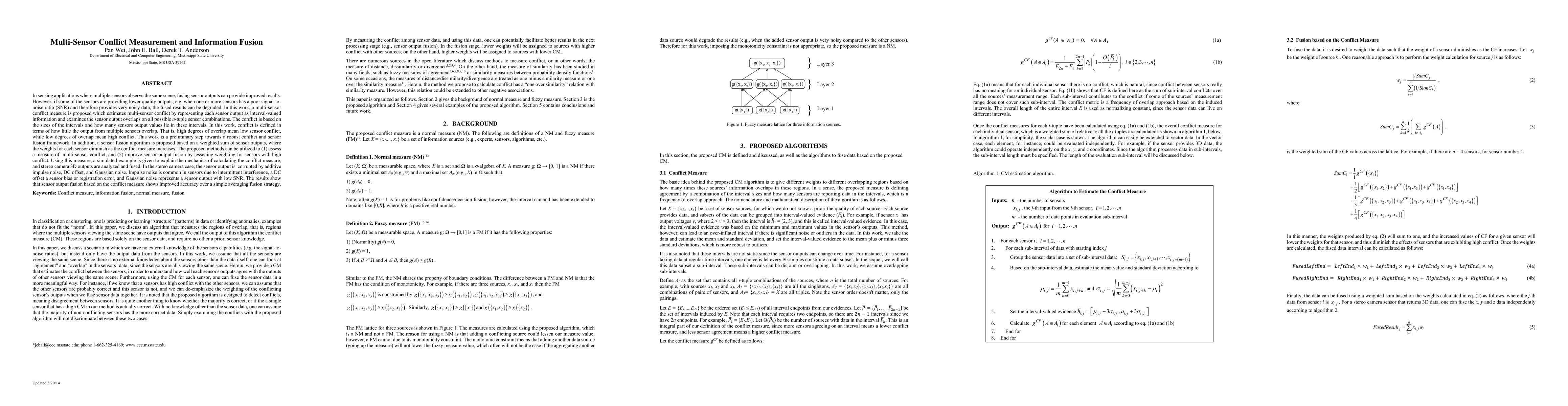 In sensing applications where multiple sensors observe the same scene, fusing sensor outputs can provide improved results. However, if some of the sensors are providing lower quality outputs, the fused results can be degraded. In this work, a multi-sensor conflict measure is proposed which estimates multi-sensor conflict by representing each sensor output as interval-valued information and examines the sensor output overlaps on all possible n-tuple sensor combinations. The conflict is based on the sizes of the intervals and how many sensors output values lie in these intervals. In this work, conflict is defined in terms of how little the output from multiple sensors overlap. That is, high degrees of overlap mean low sensor conflict, while low degrees of overlap mean high conflict. This work is a preliminary step towards a robust conflict and sensor fusion framework. In addition, a sensor fusion algorithm is proposed based on a weighted sum of sensor outputs, where the weights for each sensor diminish as the conflict measure increases. The proposed methods can be utilized to (1) assess a measure of multi-sensor conflict, and (2) improve sensor output fusion by lessening weighting for sensors with high conflict. Using this measure, a simulated example is given to explain the mechanics of calculating the conflict measure, and stereo camera 3D outputs are analyzed and fused. In the stereo camera case, the sensor output is corrupted by additive impulse noise, DC offset, and Gaussian noise. Impulse noise is common in sensors due to intermittent interference, a DC offset a sensor bias or registration error, and Gaussian noise represents a sensor output with low SNR. The results show that sensor output fusion based on the conflict measure shows improved accuracy over a simple averaging fusion strategy.