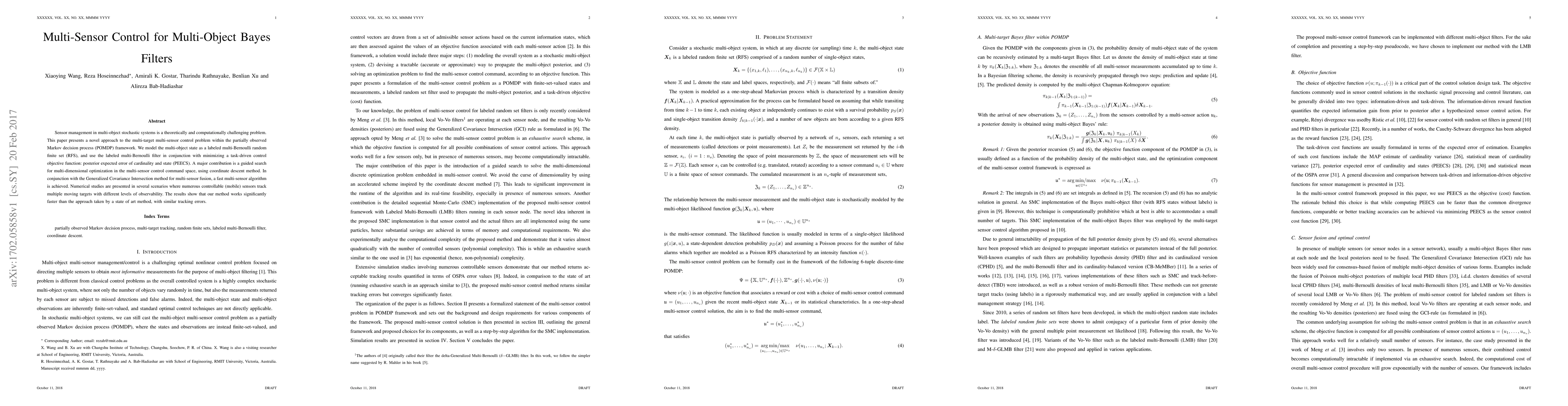 This paper introduces a novel multi-sensor control approach for multi-object tracking within a POMDP framework, employing a labeled multi-Bernoulli filter and minimizing a task-driven control objective. The method uses coordinate descent for multi-dimensional optimization and achieves faster results compared to state-of-the-art methods, while maintaining similar tracking accuracy.