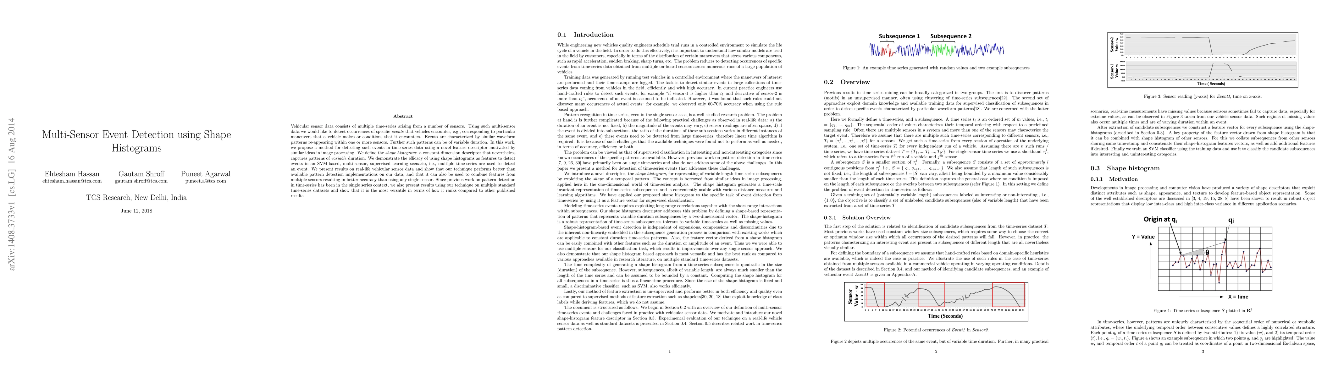 This paper proposes a method for detecting events in vehicular sensor data using shape histograms, a novel feature descriptor inspired by image processing. The shape histogram captures variable-duration patterns in multi-sensor time-series data, improving event detection accuracy compared to existing methods.