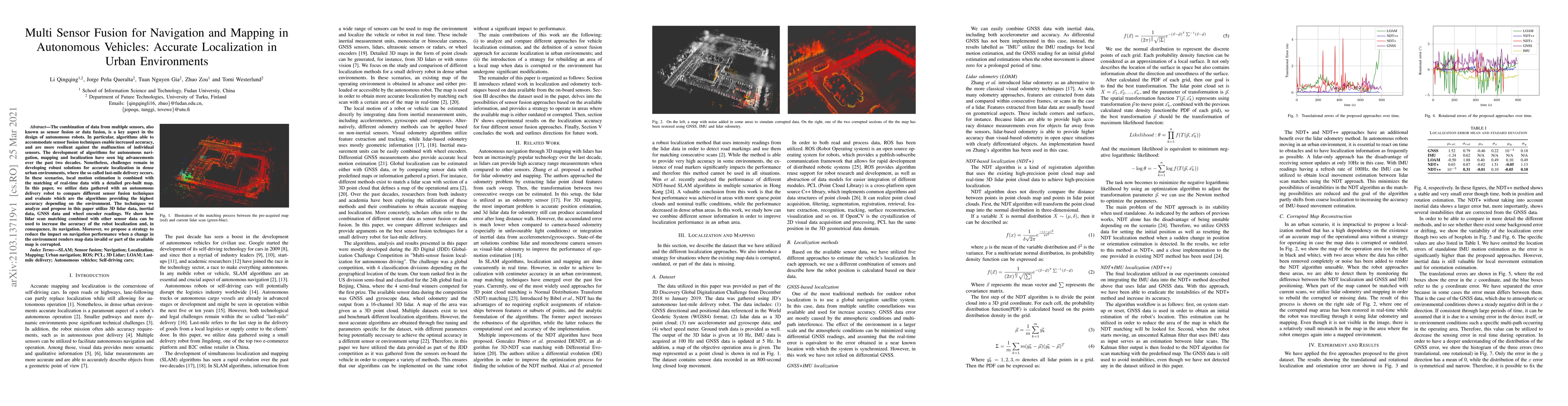 This paper investigates sensor fusion techniques for autonomous vehicle navigation and mapping, focusing on accurate localization in urban environments. It evaluates various algorithms using data from 3D lidar, inertial sensors, GNSS, and wheel encoders, demonstrating that lidar scan matching enhances localization accuracy and proposes a strategy to mitigate navigation performance issues when map data becomes invalid.