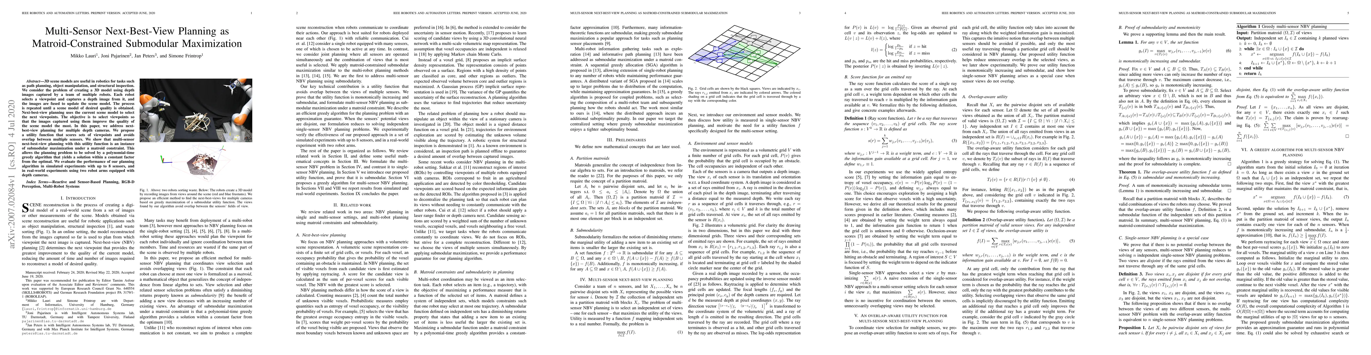This paper proposes a method for next-best-view planning in multi-robot systems using depth cameras, framing it as submodular maximization under a matroid constraint. The approach selects viewpoints to optimize scene model quality while avoiding sensor overlap, and is evaluated in both simulations and real-world scenarios.