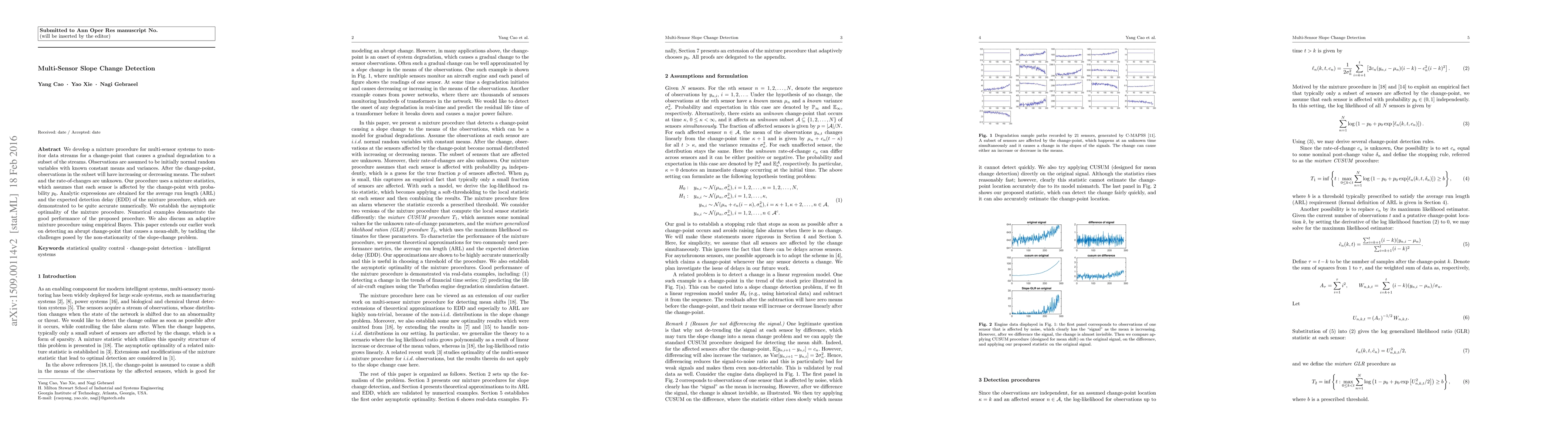 This paper proposes a mixture procedure for multi-sensor systems to detect gradual degradations in data streams through slope changes. The method is shown to be asymptotically optimal and effectively identifies unknown subsets and change rates, outperforming earlier techniques designed for abrupt mean-shifts.