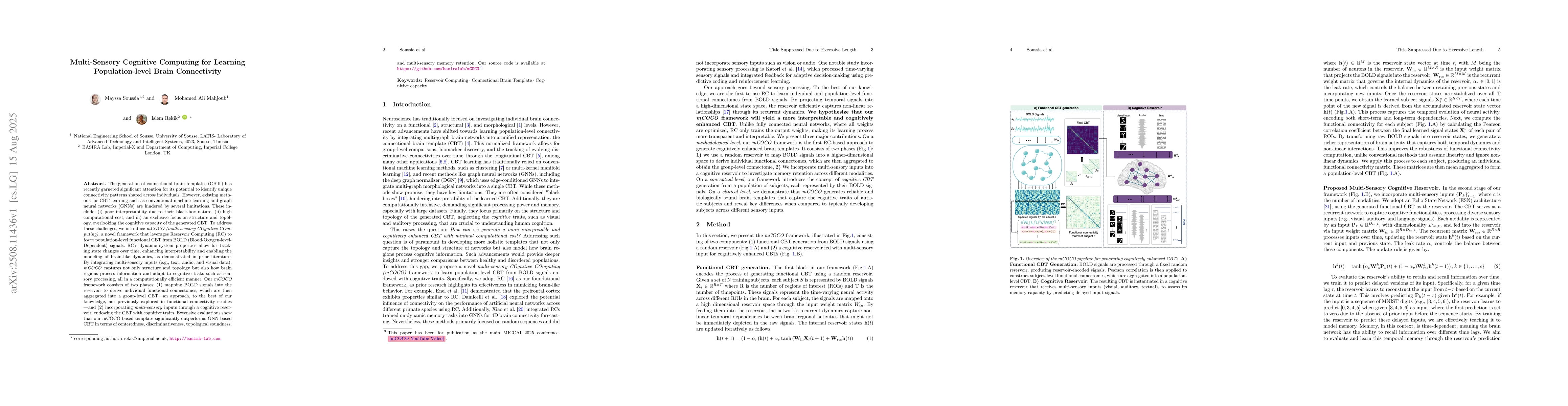 The generation of connectional brain templates (CBTs) has recently garnered significant attention for its potential to identify unique connectivity patterns shared across individuals. However, existing methods for CBT learning such as conventional machine learning and graph neural networks (GNNs) are hindered by several limitations. These include: (i) poor interpretability due to their black-box nature, (ii) high computational cost, and (iii) an exclusive focus on structure and topology, overlooking the cognitive capacity of the generated CBT. To address these challenges, we introduce mCOCO (multi-sensory COgnitive COmputing), a novel framework that leverages Reservoir Computing (RC) to learn population-level functional CBT from BOLD (Blood-Oxygen-level-Dependent) signals. RC's dynamic system properties allow for tracking state changes over time, enhancing interpretability and enabling the modeling of brain-like dynamics, as demonstrated in prior literature. By integrating multi-sensory inputs (e.g., text, audio, and visual data), mCOCO captures not only structure and topology but also how brain regions process information and adapt to cognitive tasks such as sensory processing, all in a computationally efficient manner. Our mCOCO framework consists of two phases: (1) mapping BOLD signals into the reservoir to derive individual functional connectomes, which are then aggregated into a group-level CBT - an approach, to the best of our knowledge, not previously explored in functional connectivity studies - and (2) incorporating multi-sensory inputs through a cognitive reservoir, endowing the CBT with cognitive traits. Extensive evaluations show that our mCOCO-based template significantly outperforms GNN-based CBT in terms of centeredness, discriminativeness, topological soundness, and multi-sensory memory retention. Our source code is available at https://github.com/basiralab/mCOCO.