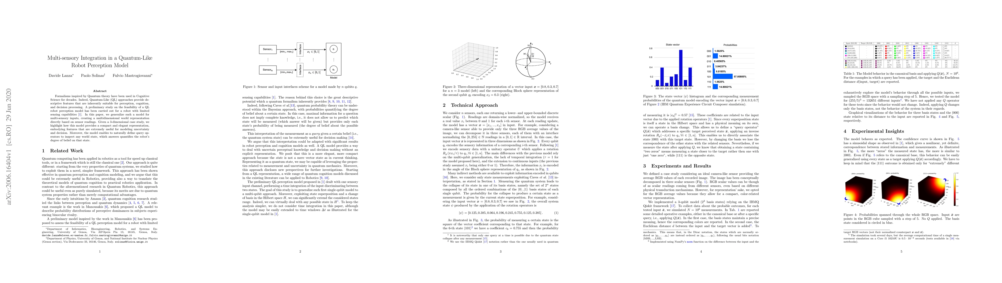 This paper presents a Quantum-Like robot perception model for multi-sensory inputs, offering a compact world representation embodying uncertainty features. It introduces query operators to quantify the robot's belief in any world state, based on sensor readings.