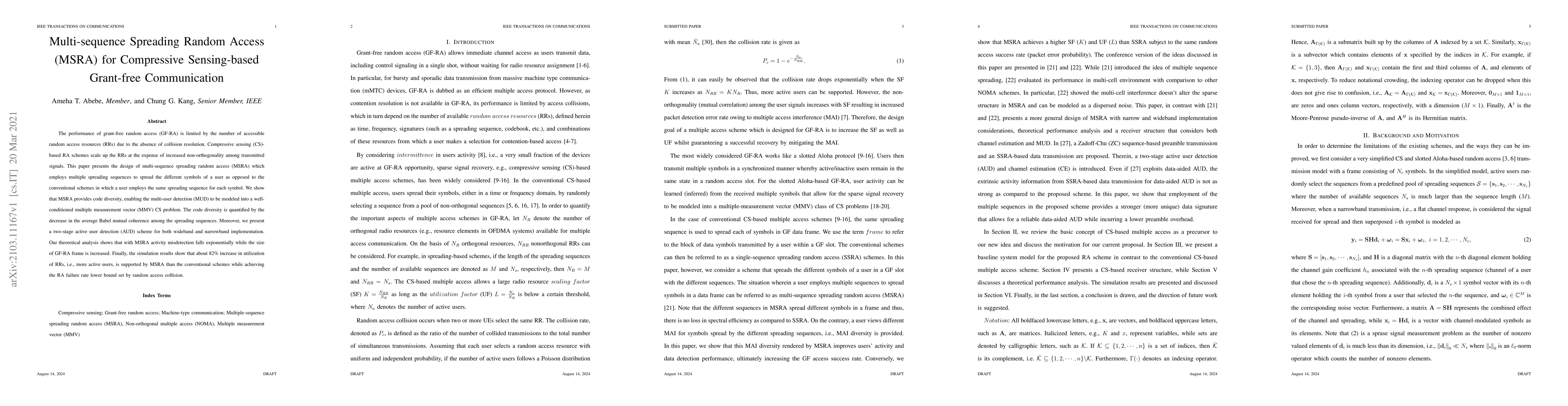 This paper introduces multi-sequence spreading random access (MSRA) for grant-free communication, enhancing compressive sensing-based random access by employing multiple spreading sequences per user. MSRA achieves code diversity, reducing mutual coherence and enabling efficient multi-user detection, resulting in an 82% increase in resource utilization and significantly lower random access failure rates.